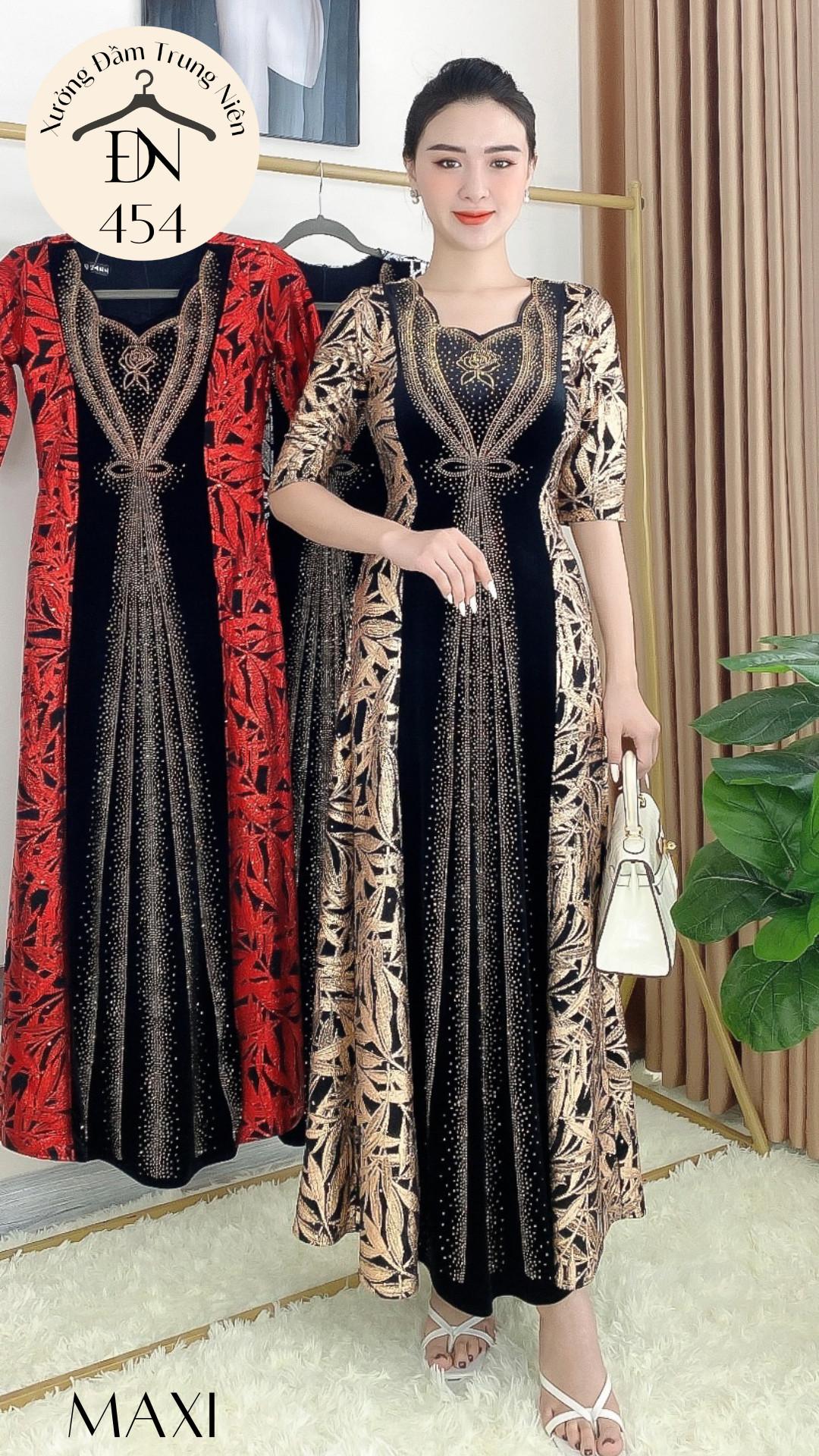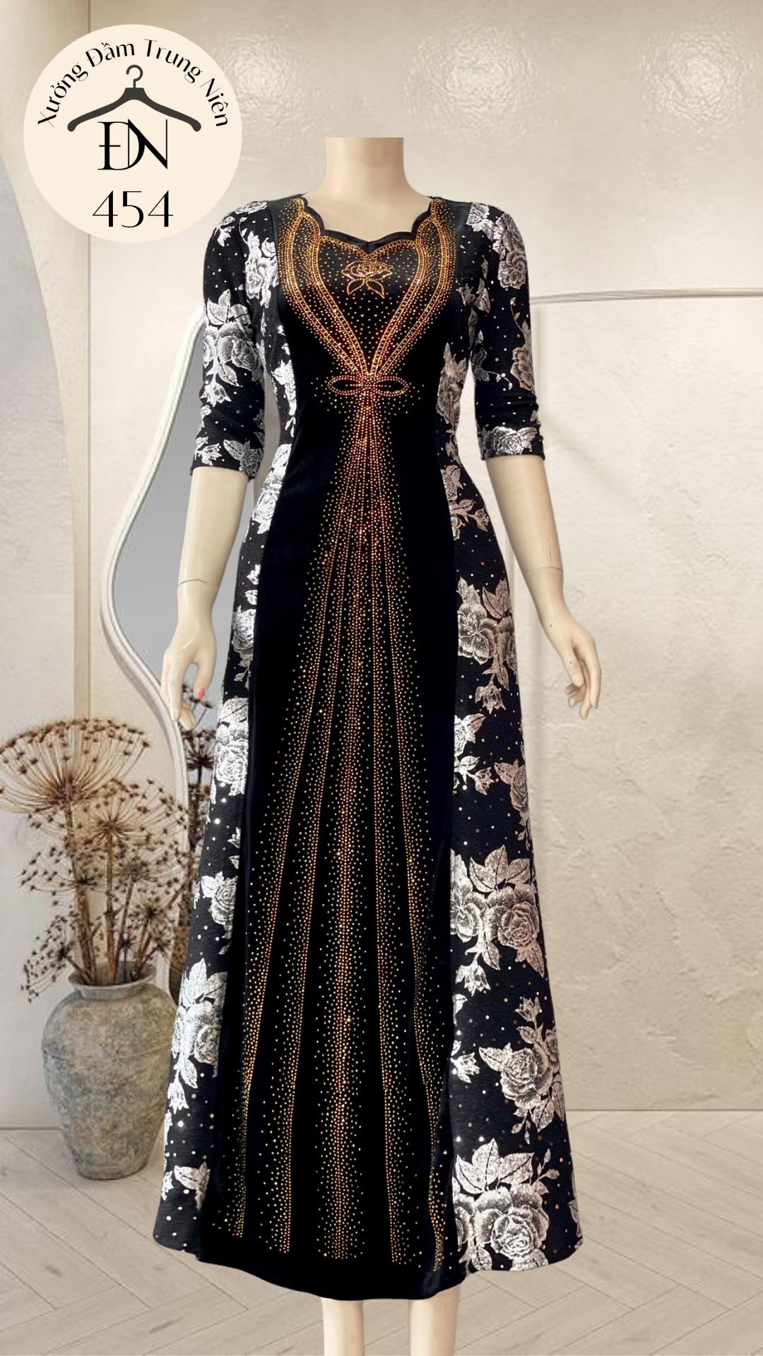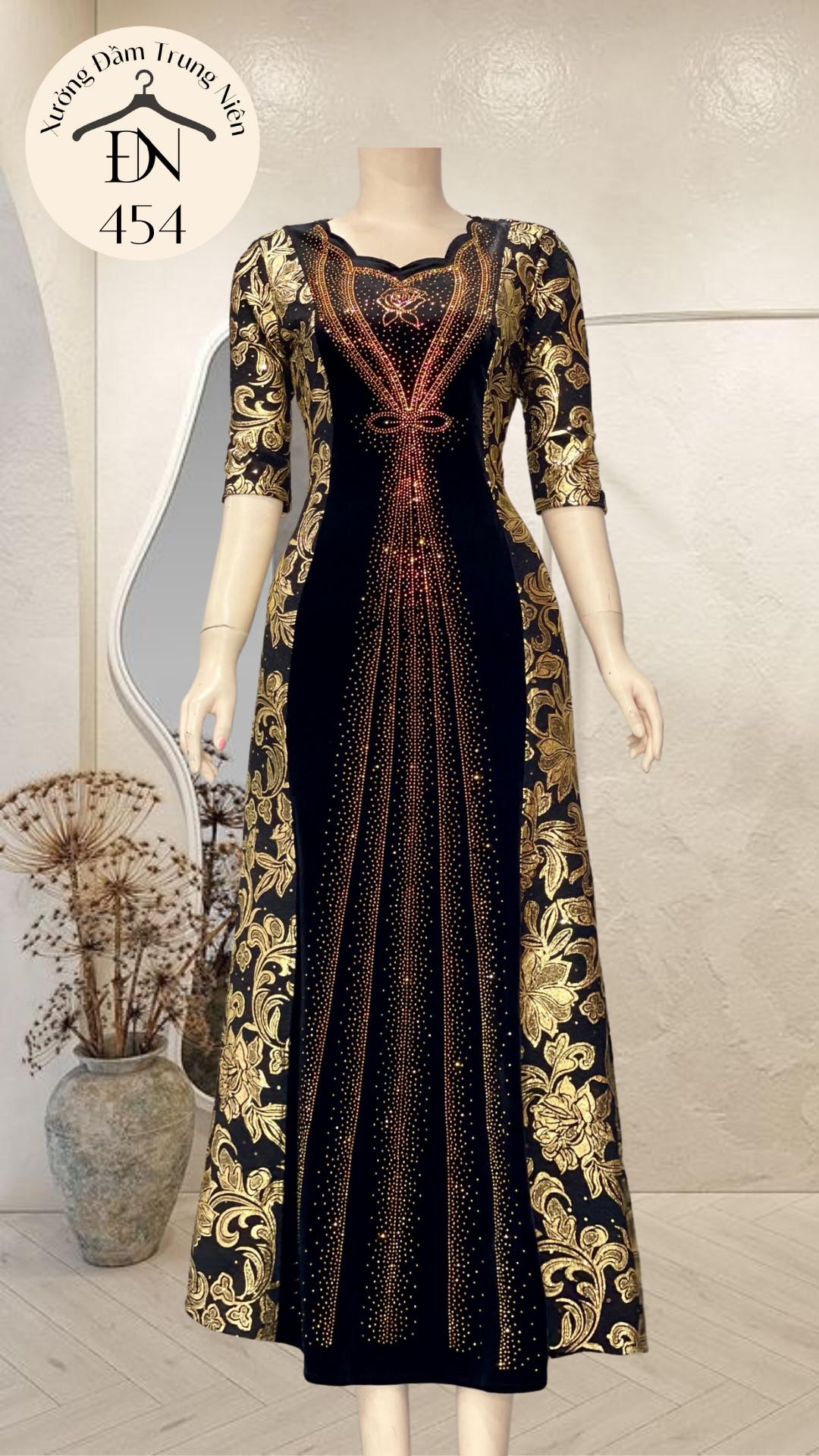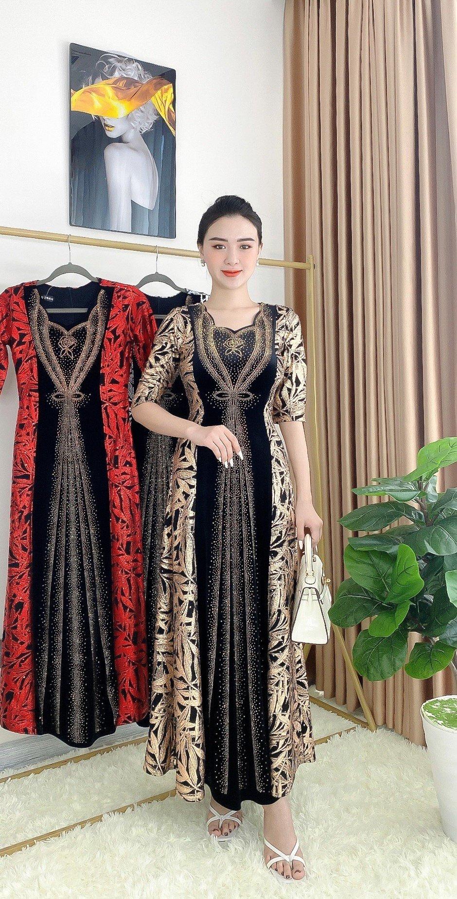 1. Chi tiết sản phẩm: Đầm dạ hội trung niên chất nhũ kim sa phối nhung có lớp lót, đính đá cao câp, co giãn cực tốt cho mẹ dự tiệc sang trọng bigsize cao cấp DN26