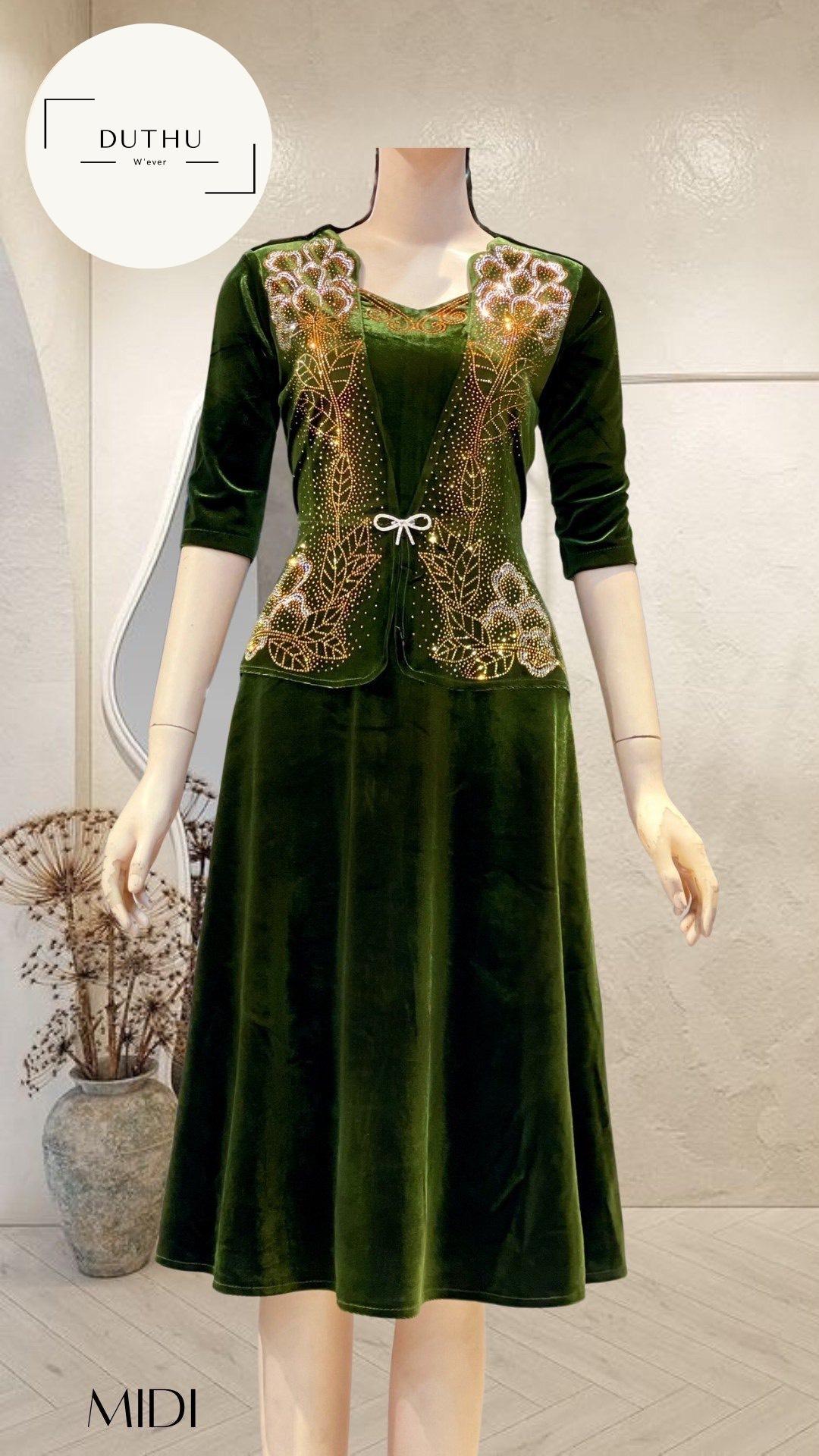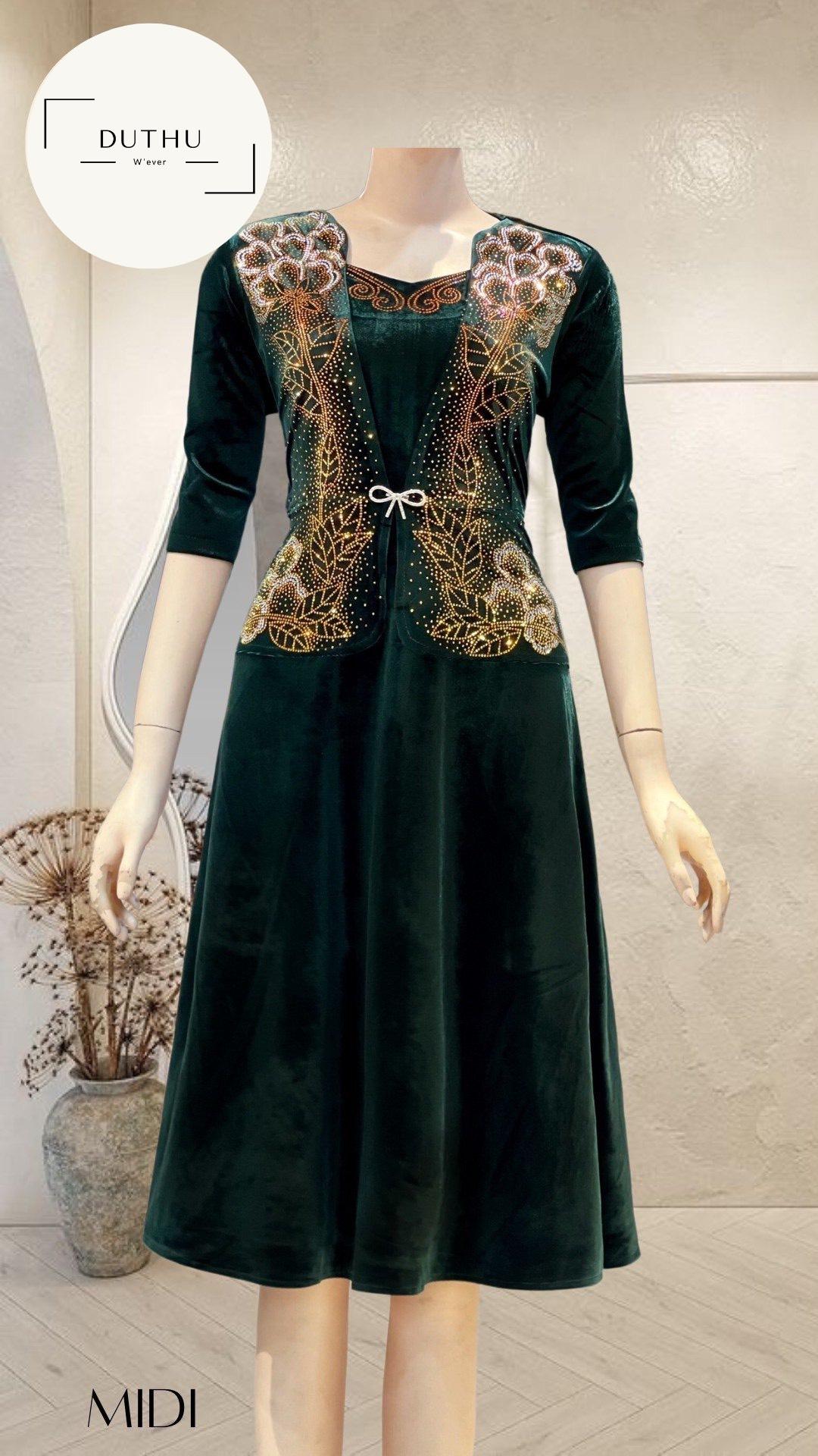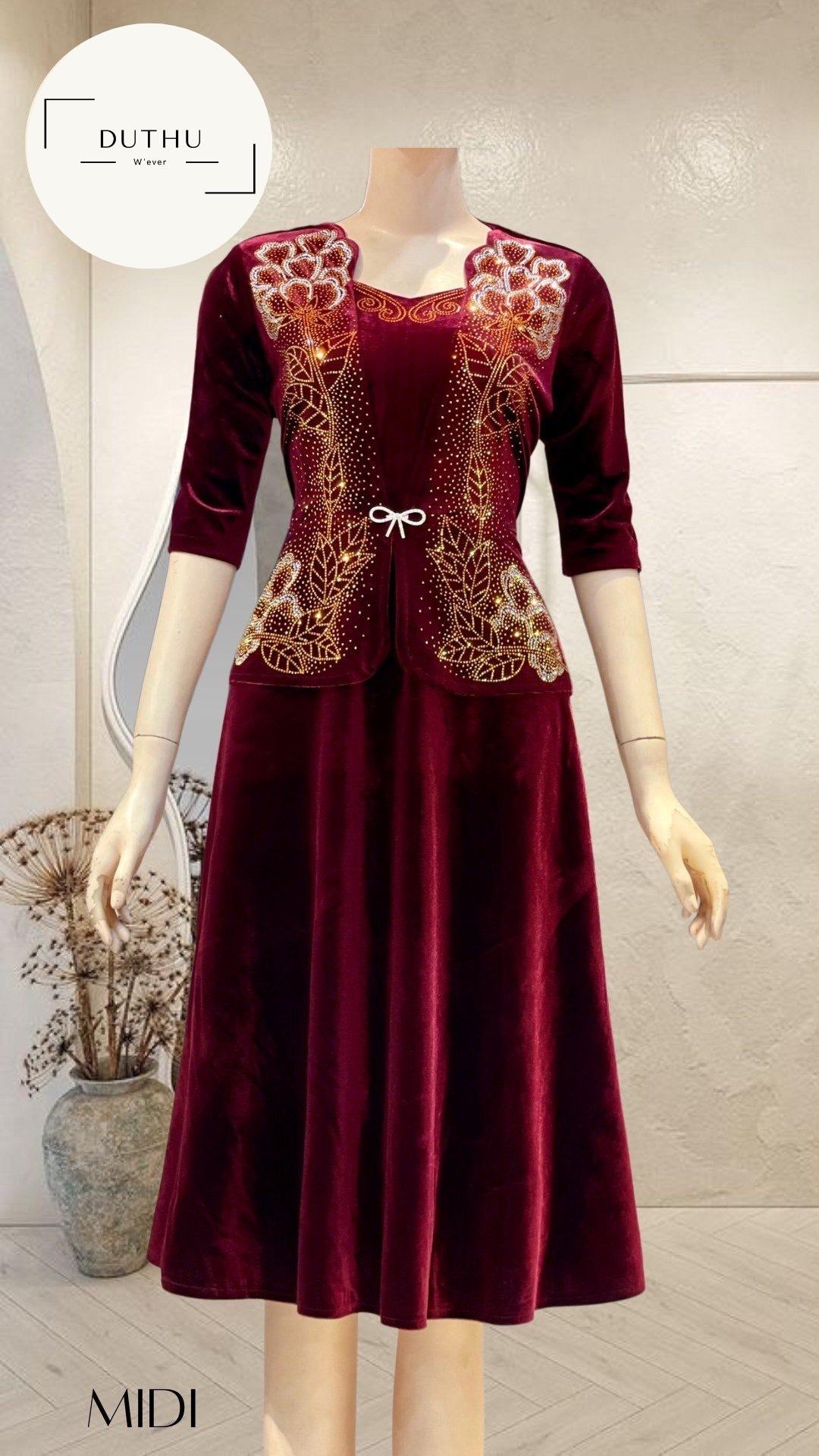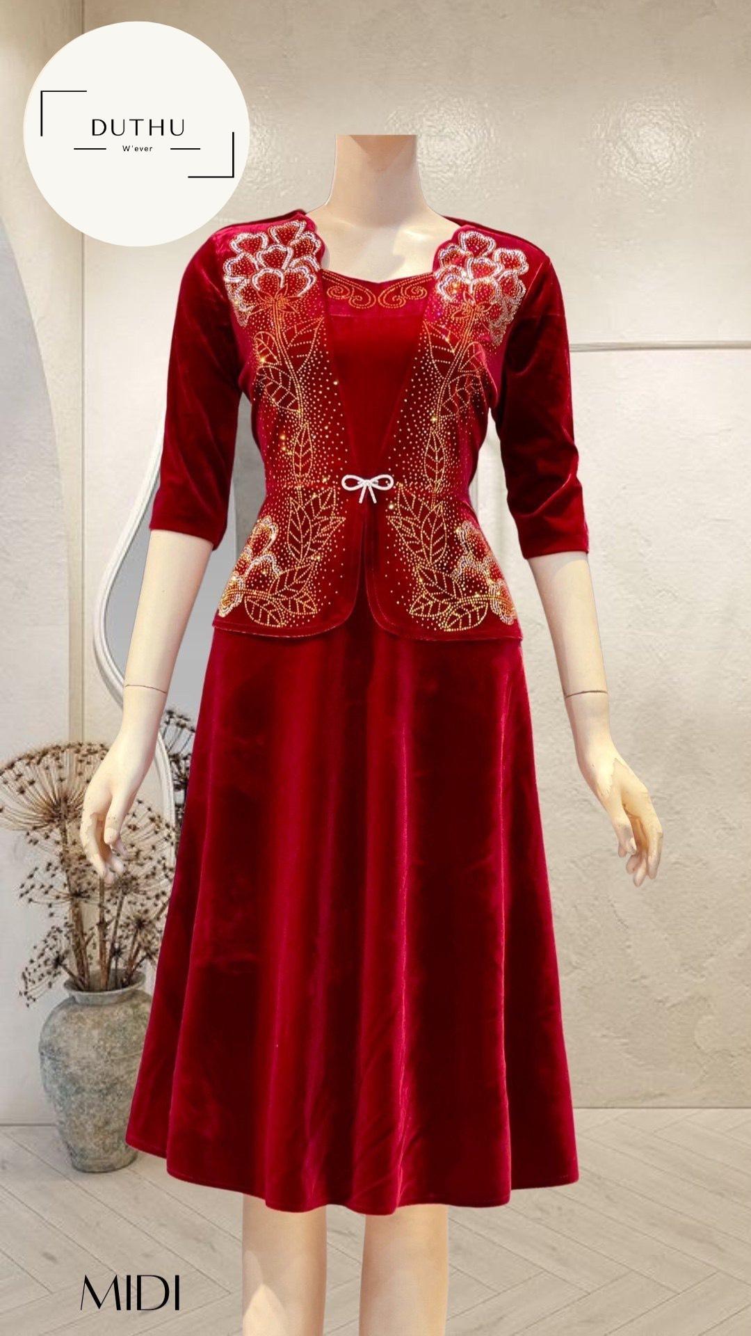 1. Chi tiết sản phẩm: Đầm dạ hội trung niên chất Nhung co giãn cực tốt, đính đá cao cấp cho mẹ dự tiệc sang trọng bigsize DN24