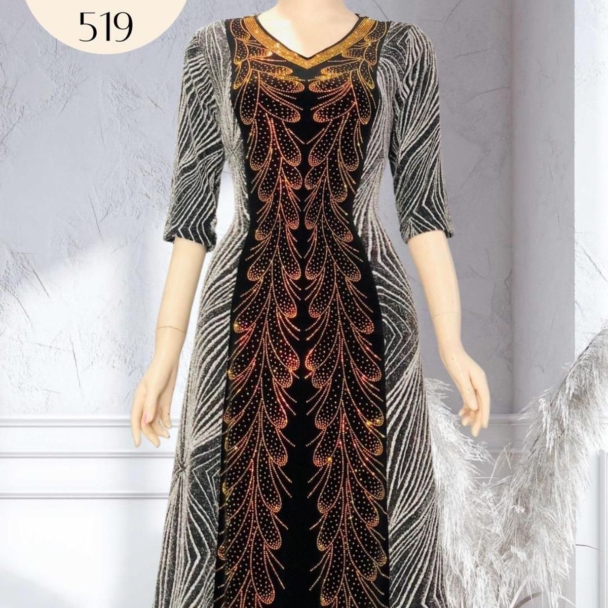 Chất liệu: Nhũ kim sa phối Nhung, đính đá tinh tế, chất vải có tính co - giãn linh hoạt, thấm hút mồ hôi tốt - thoáng mát.