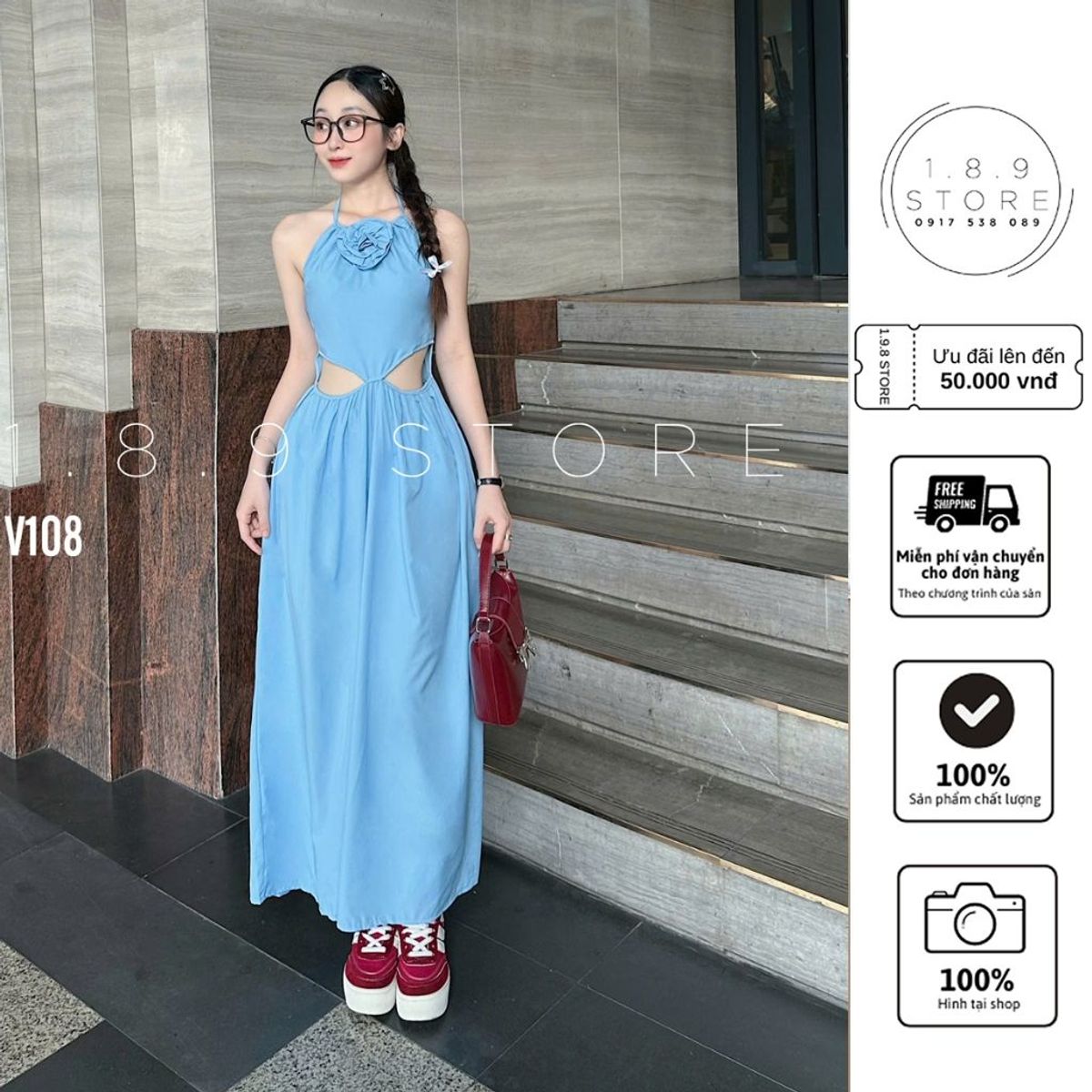 Đầm Thời Trang Nữ Dự Tiệc Chất Lụa 100D Cổ Yếm Nơ Hoa Ngực Không Tay Xẻ Eo Và Lưng Dáng Váy Dài Maxi Tôn Dáng