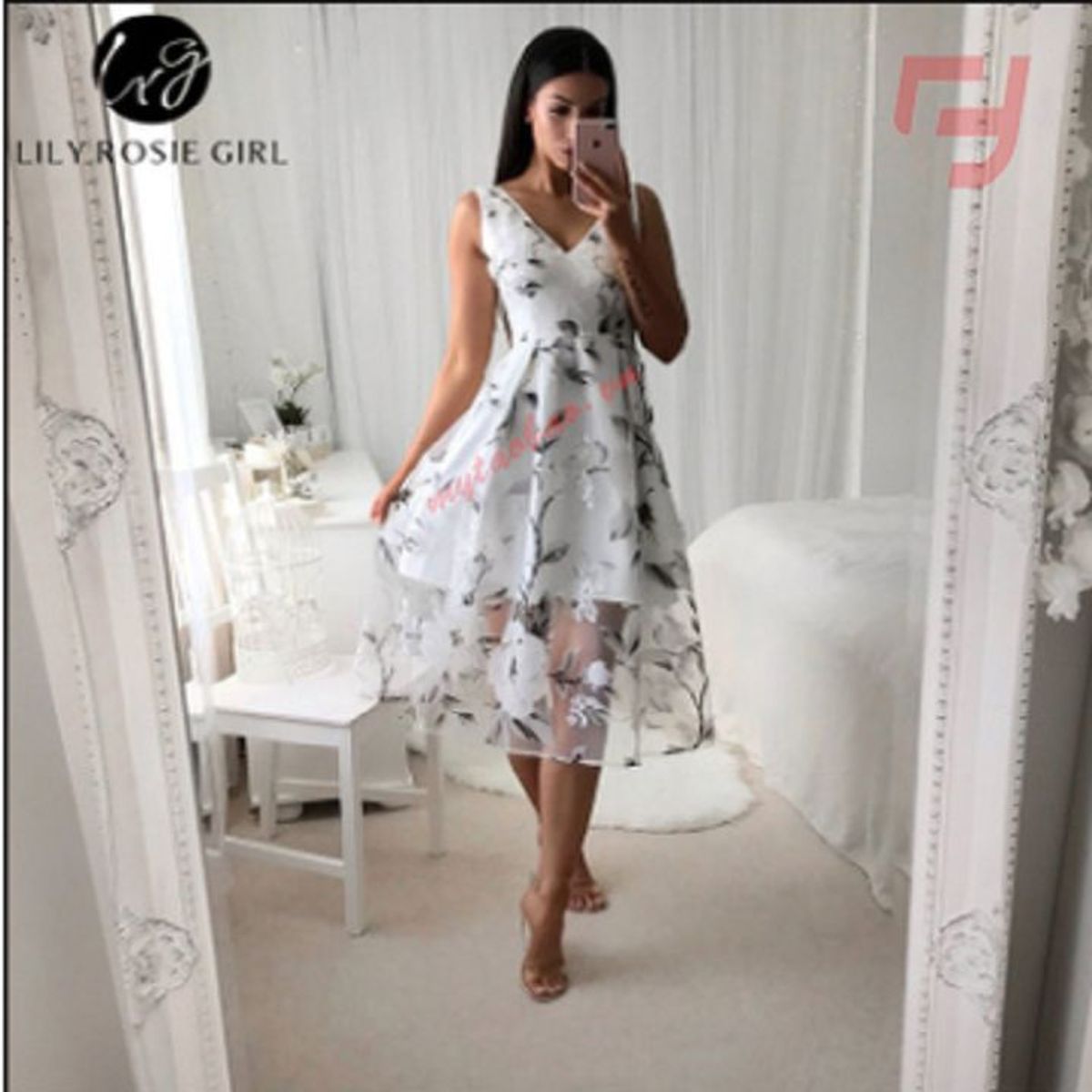 Chiếc đầm thiết kế đơn giản nhưng sang trọng và đẹp mắt khi thiết kế phần cổ chữ V kết hợp với tay áo sát nách nhìn trông thực quyến rũ, lạ mắt. Phần dưới được vay theo kiểu dạng xòe và kết hợp với lớp voan mỏng càng làm tăng thêm vẻ đẹp của chiếc váy