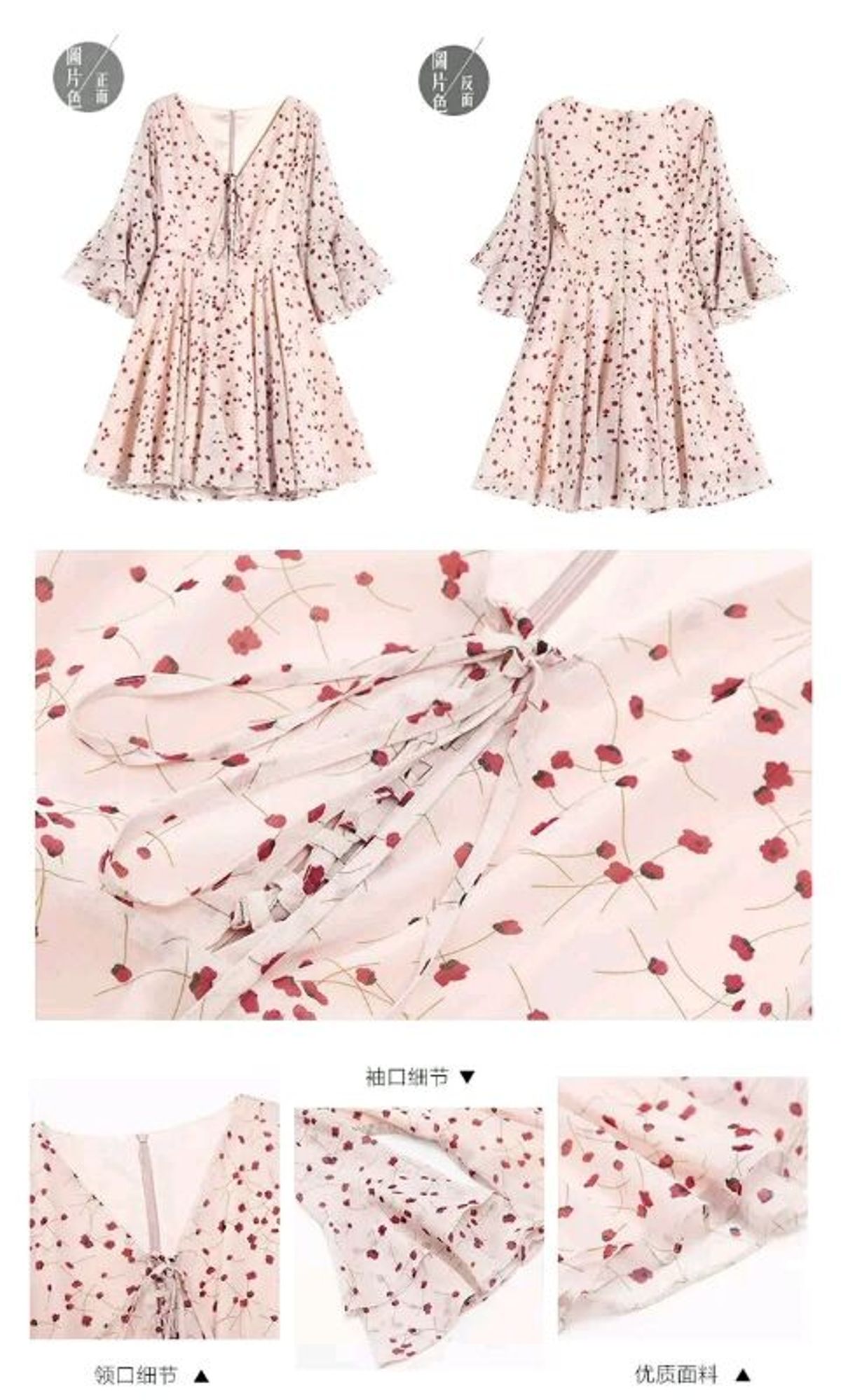 Đầm xòe hàng Quảng Châu, họa tiết y hình, cổ rút, tay bèo, đầm dài trên gối, cổ tim.