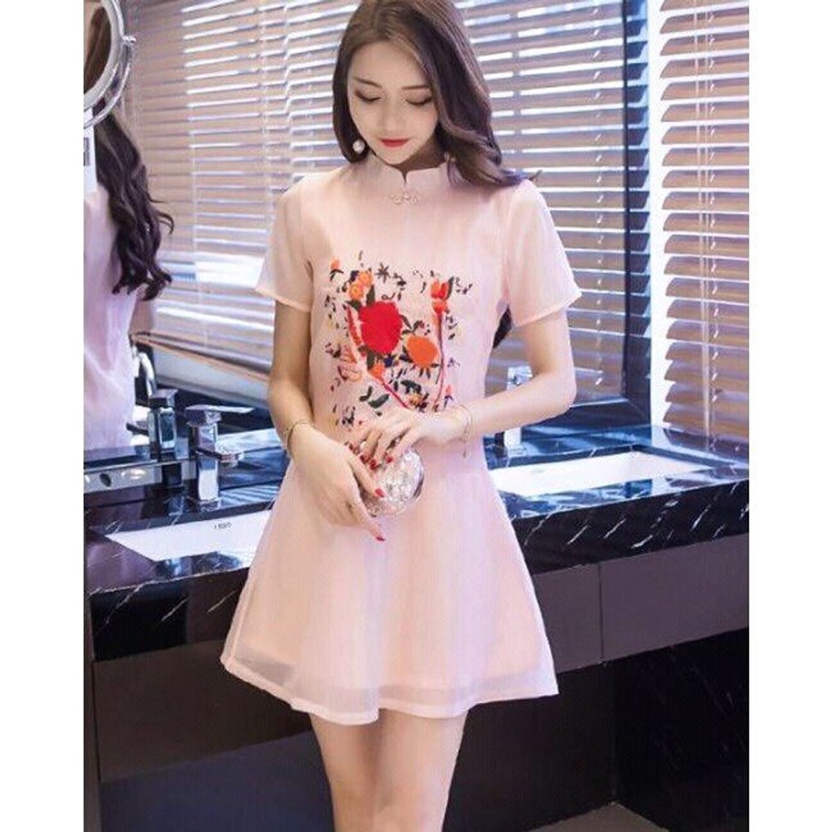 - Kiểu dáng: Đầm form suông, cổ tàu, tay ngắn, kéo khóa.