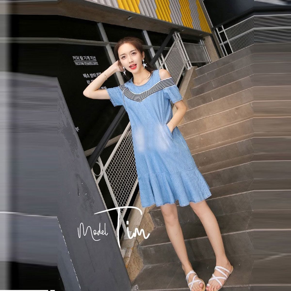 Đầm jean hở vai đuôi cá phối thun sọc cách điệu Chất Liệu: Jean wash Mềm Mại Màu Sắc: Xanh Jean Nhạt Kiểu Dáng: form suông, tay ngắn hở vai, cổ tròn, đuôi cá phối túi Freesize: Chiều dài: 88cm, Ngực <92cm, Eo <77cm, Mông 85-92cm.