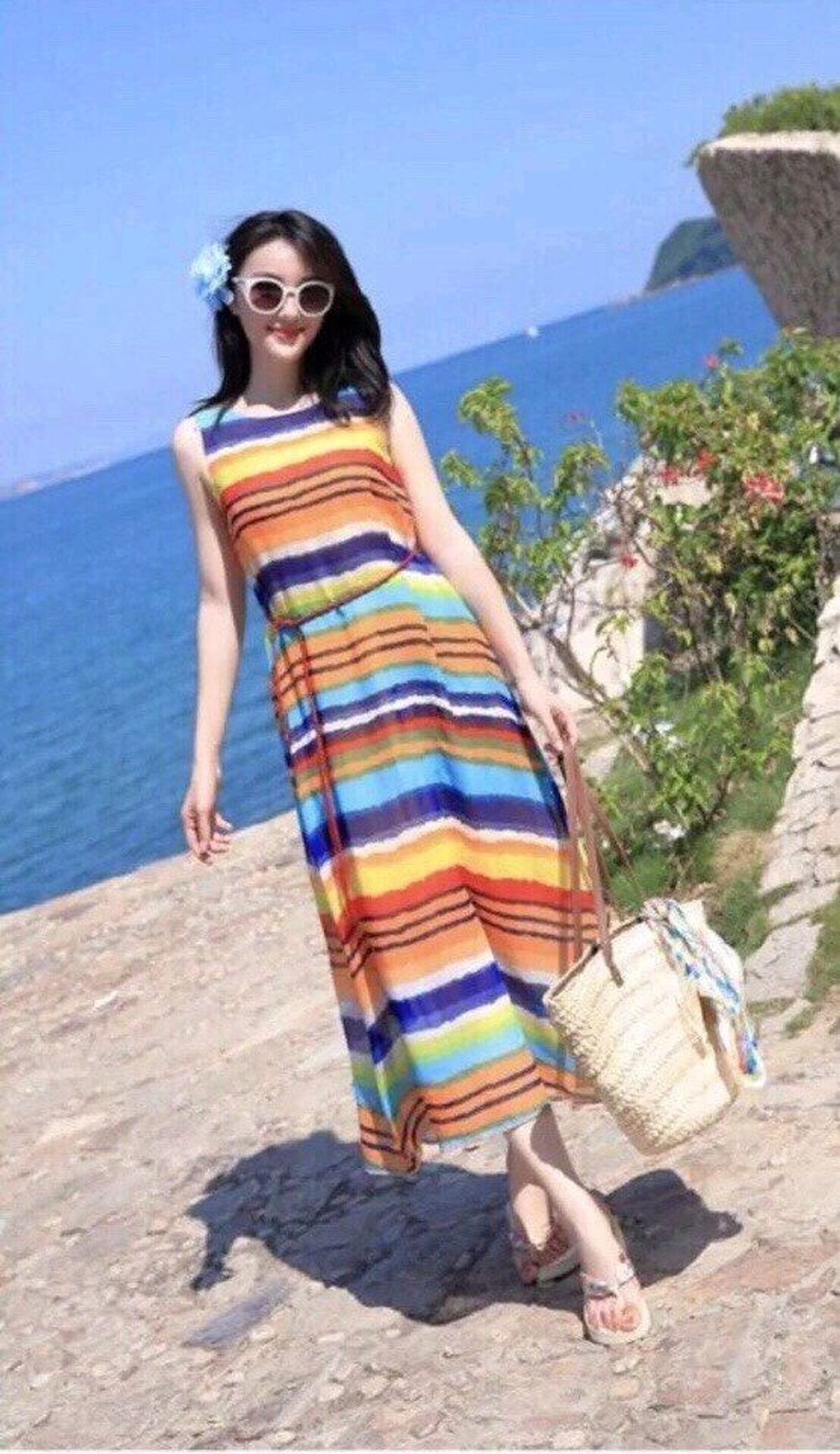ĐẦM MAXI SỌC MÀUMã: LL160DChất liệu: lụa sọc lót thunMàu: như hìnhKiểu dáng: đầm dài, cổ tròn, sát nách, kèm nịt chiếc láSize: free 46~59kg, ngực 92, dài 116