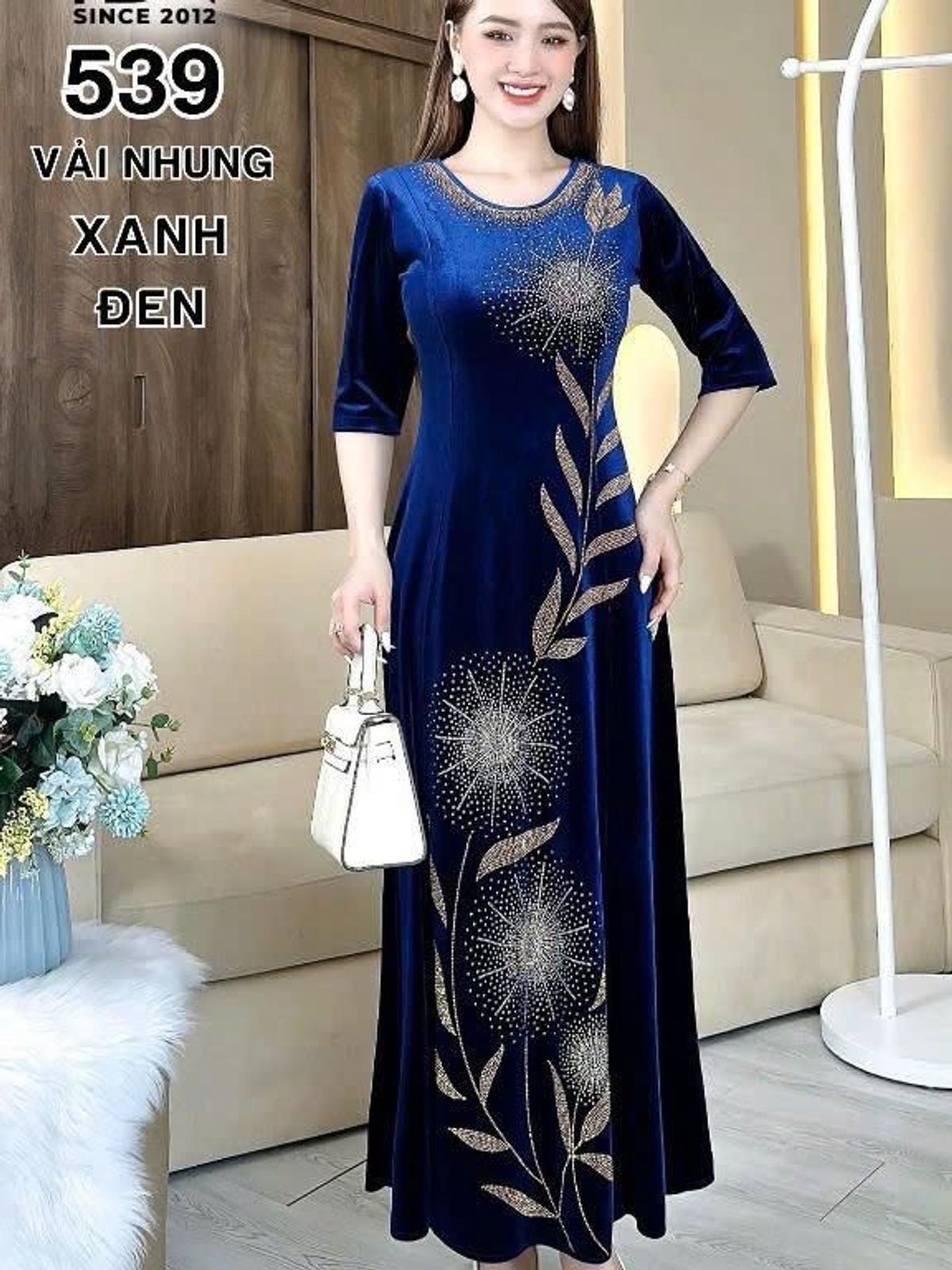 Đầm MAXI trung niên dự tiệc sang trọng vải nhung đính đá cao cấp tặng mẹ co giãn tốt bigsize 75kg M539