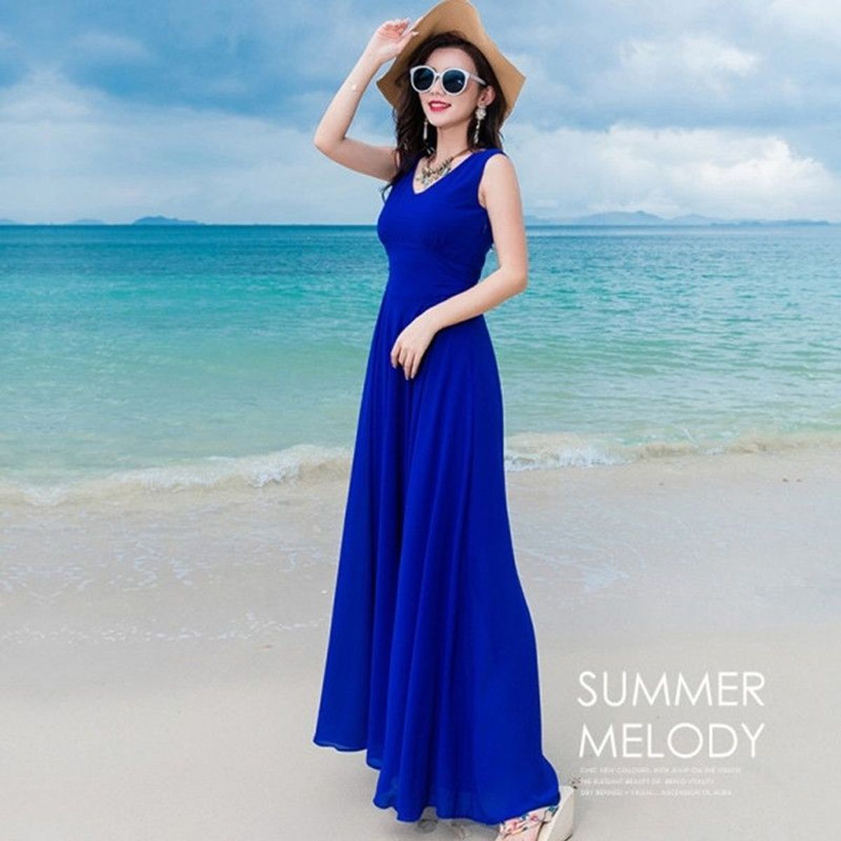 Đầm maxi dài cổ V thắt eo nơ thời trang