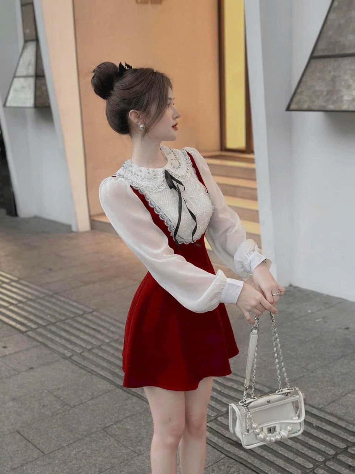 Đầm nhung phối cổ tên đính đá giá sỉ/bán buôn