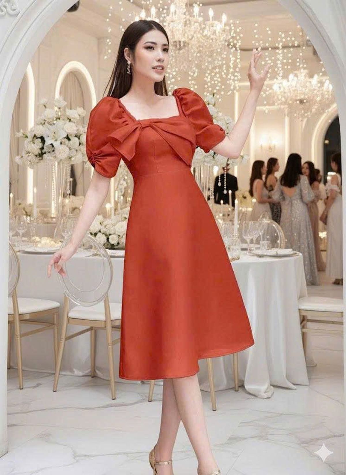 Đầm xoè cổ vuông nơ cao cấp sang trọng