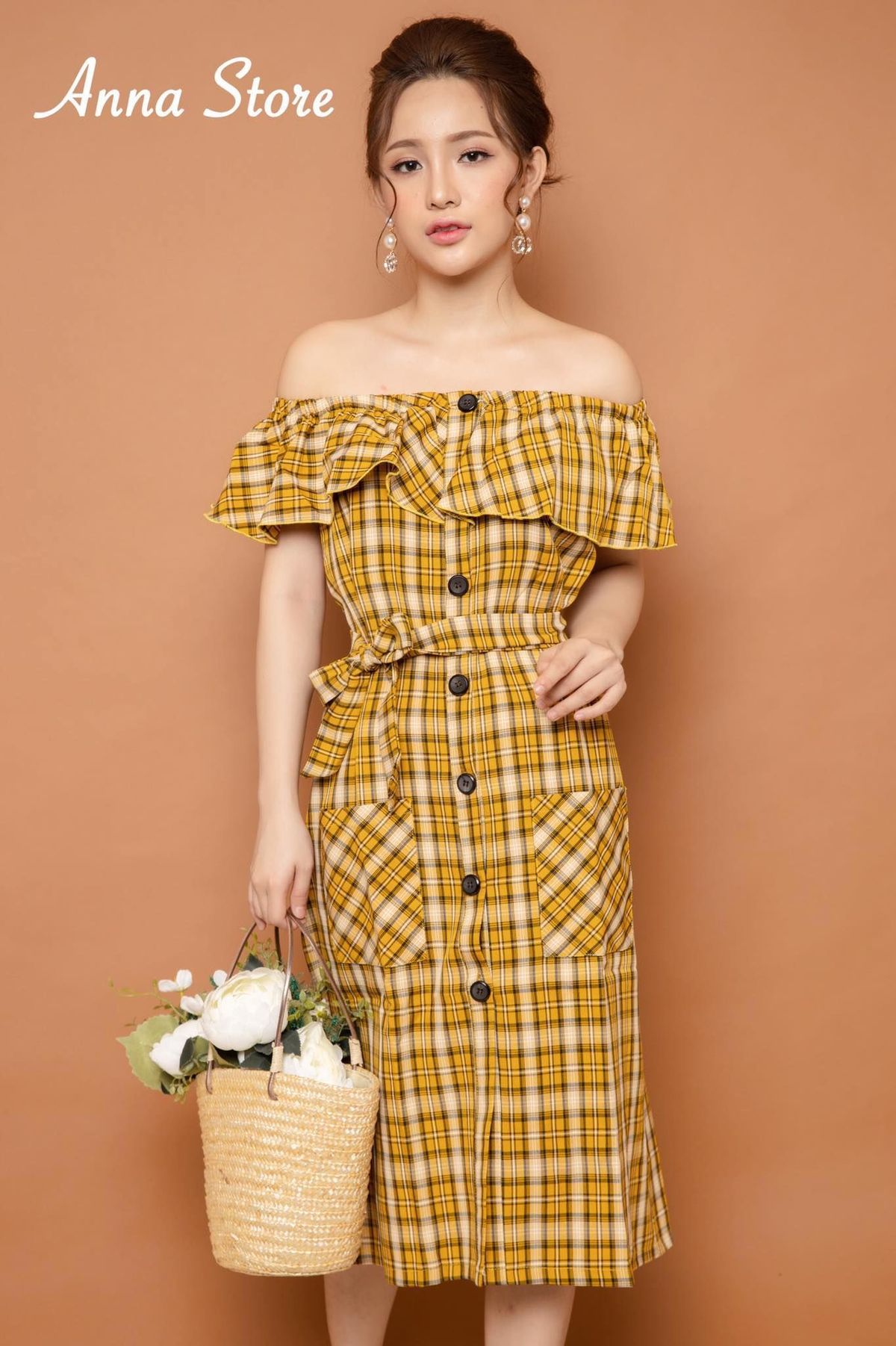 Đầm Thiết Kế Caro Bẹt Vai giá sỉ - giá bán buôn