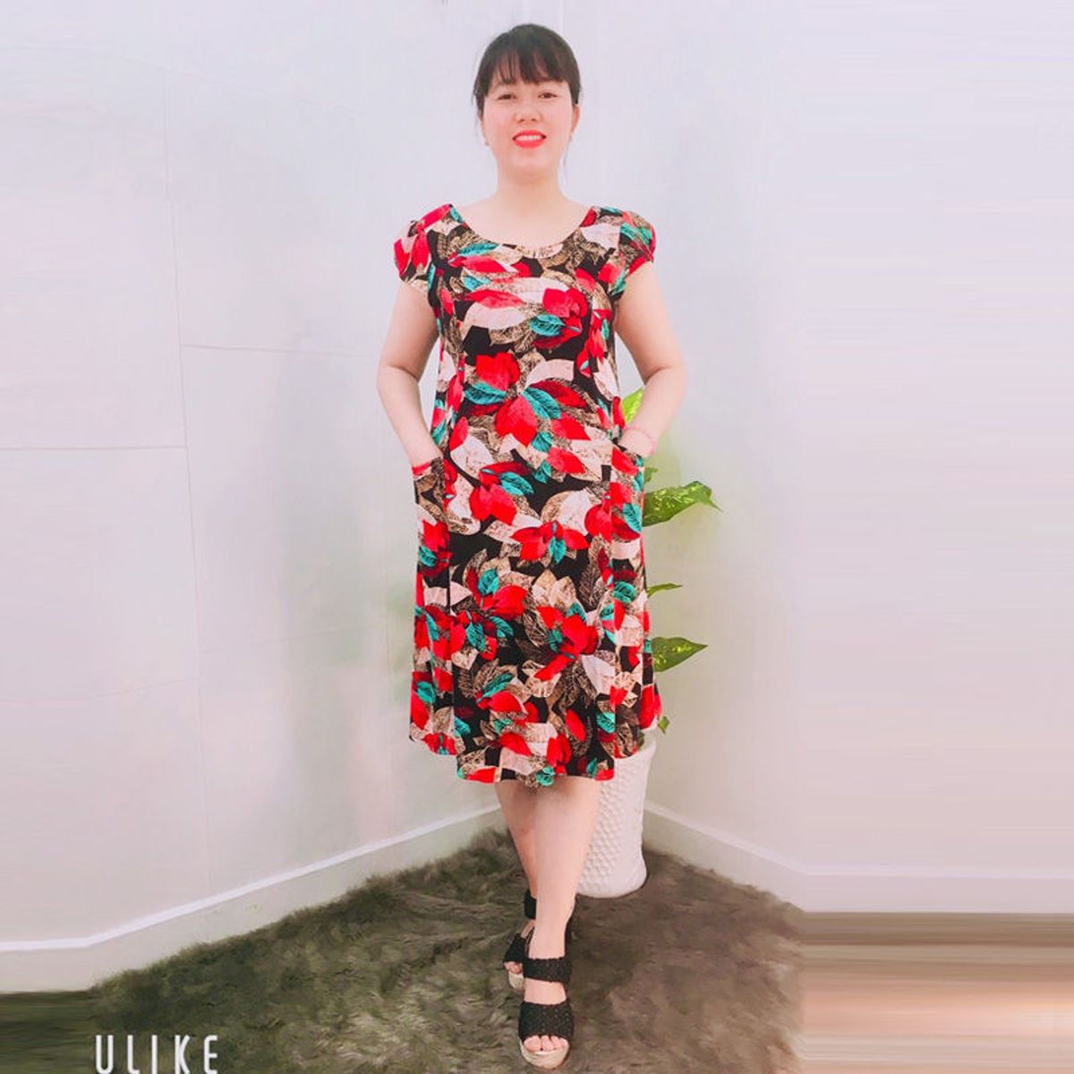 Kiểu dáng: đầm thun Thái in hoa cổ tròn đơn giản tay con phía sau lưng có dây kéo phía trước có 2 túi tiện lợi from đầm ráp 8 mảnh xòe trẻ trung nữ tính