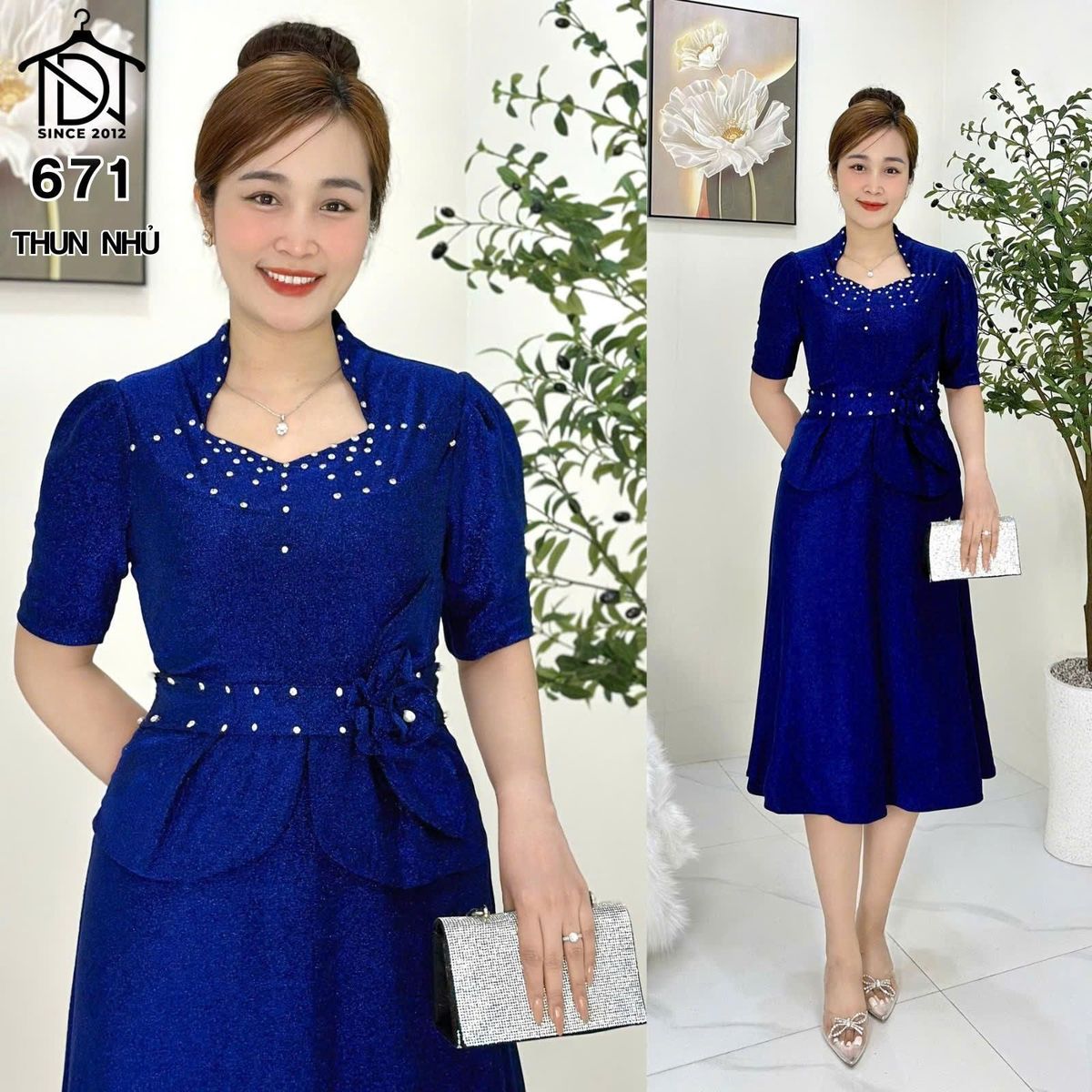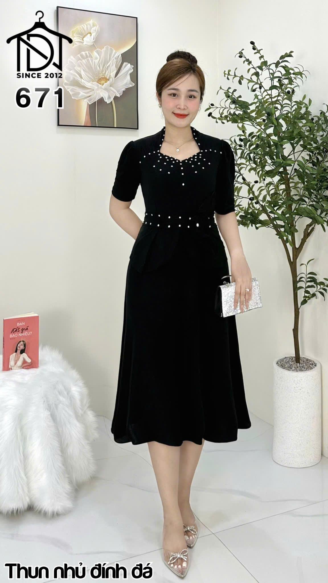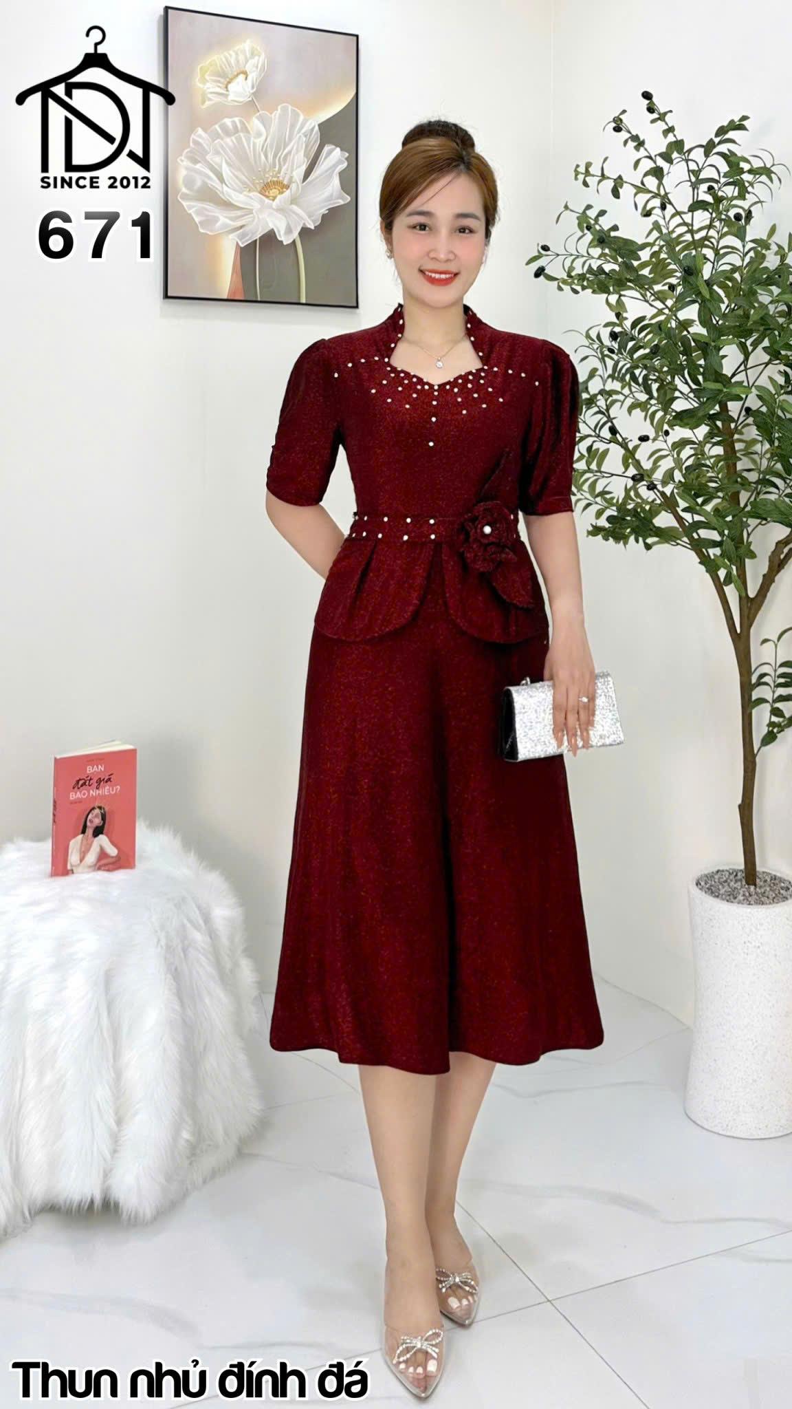 Đầm trung niên dự tiệc sang trọng vải kim tuyến nhũ kim sa đính đá tặng mẹ co giãn tốt bigsize 80kg M671 giá sỉ - giá bán buôn
