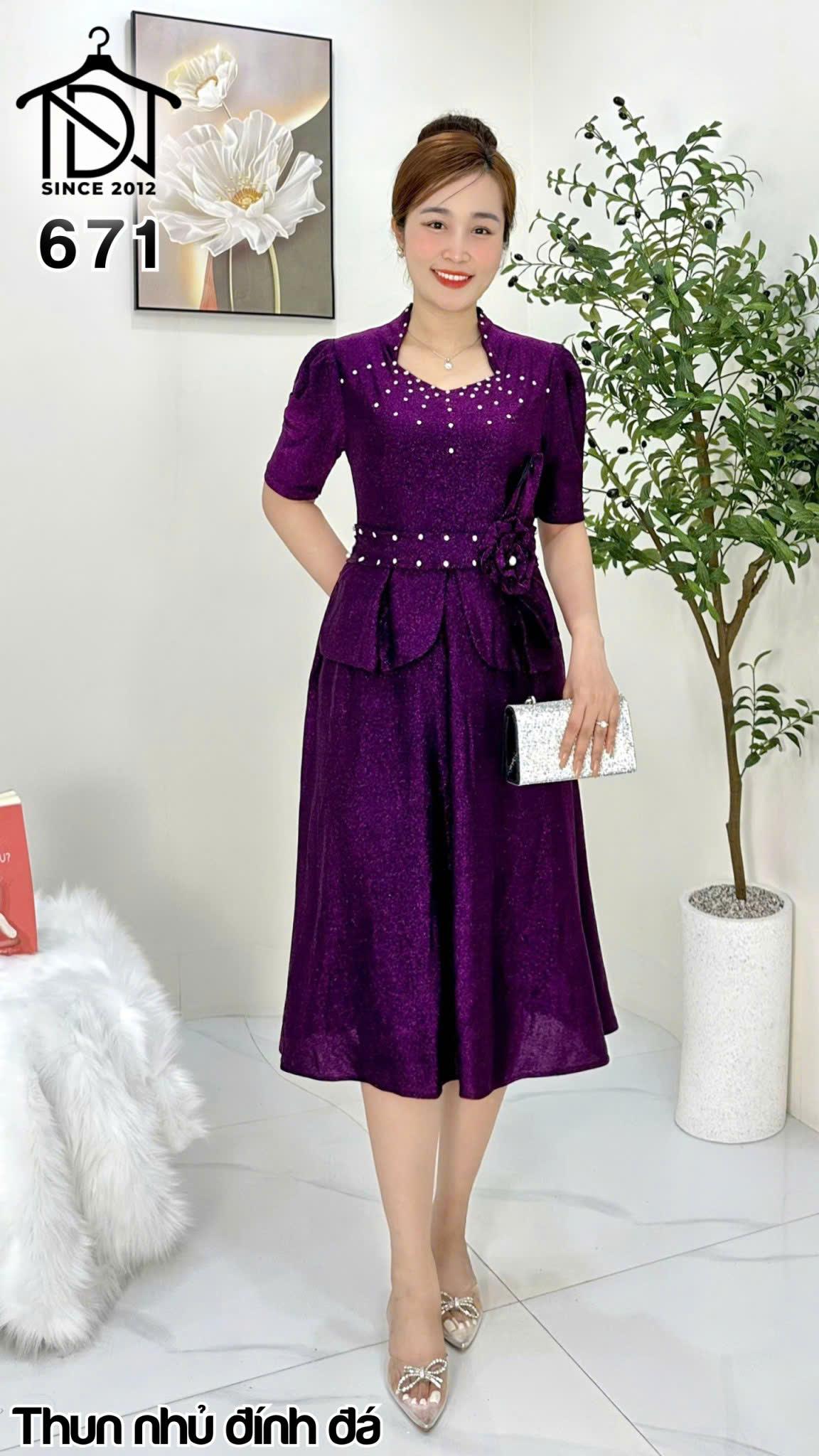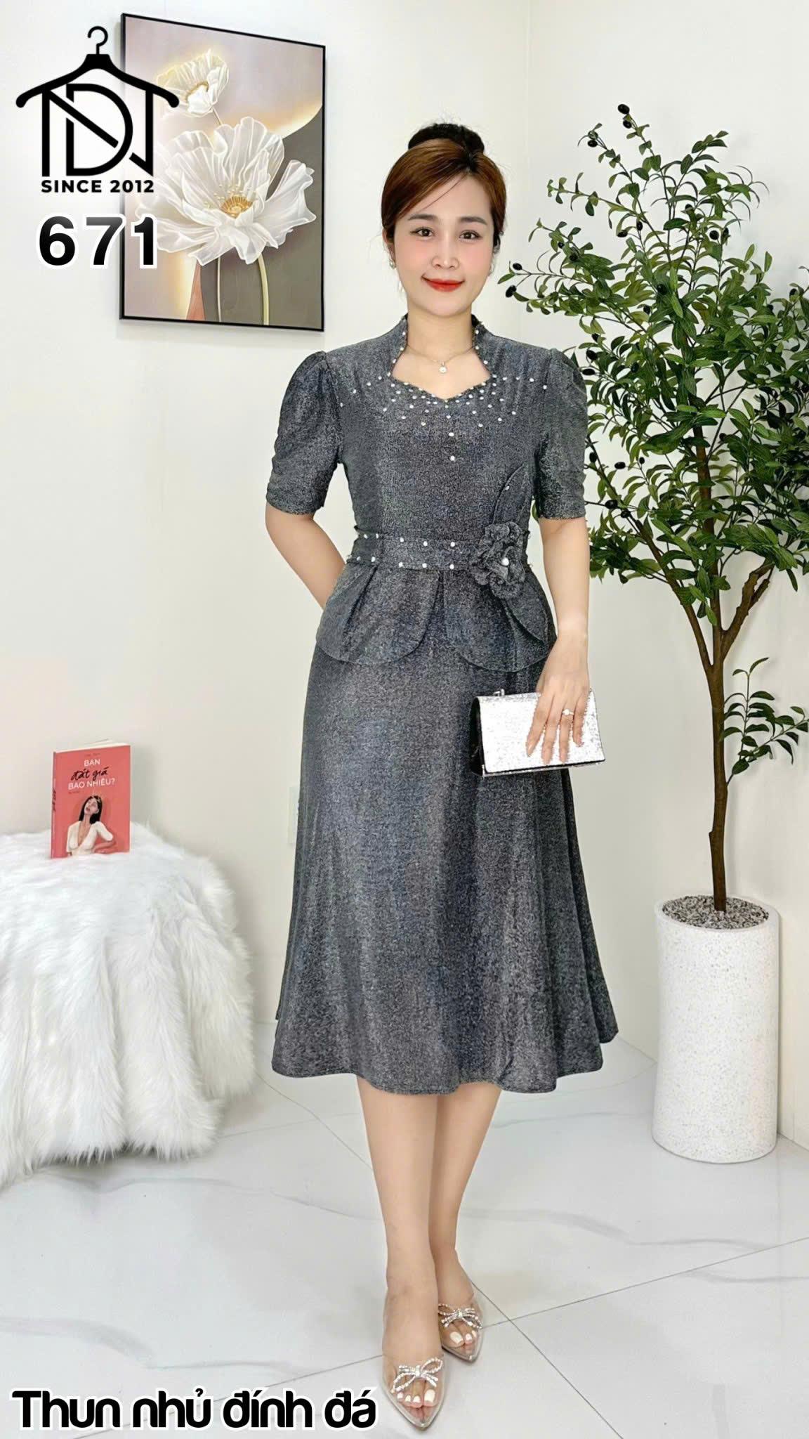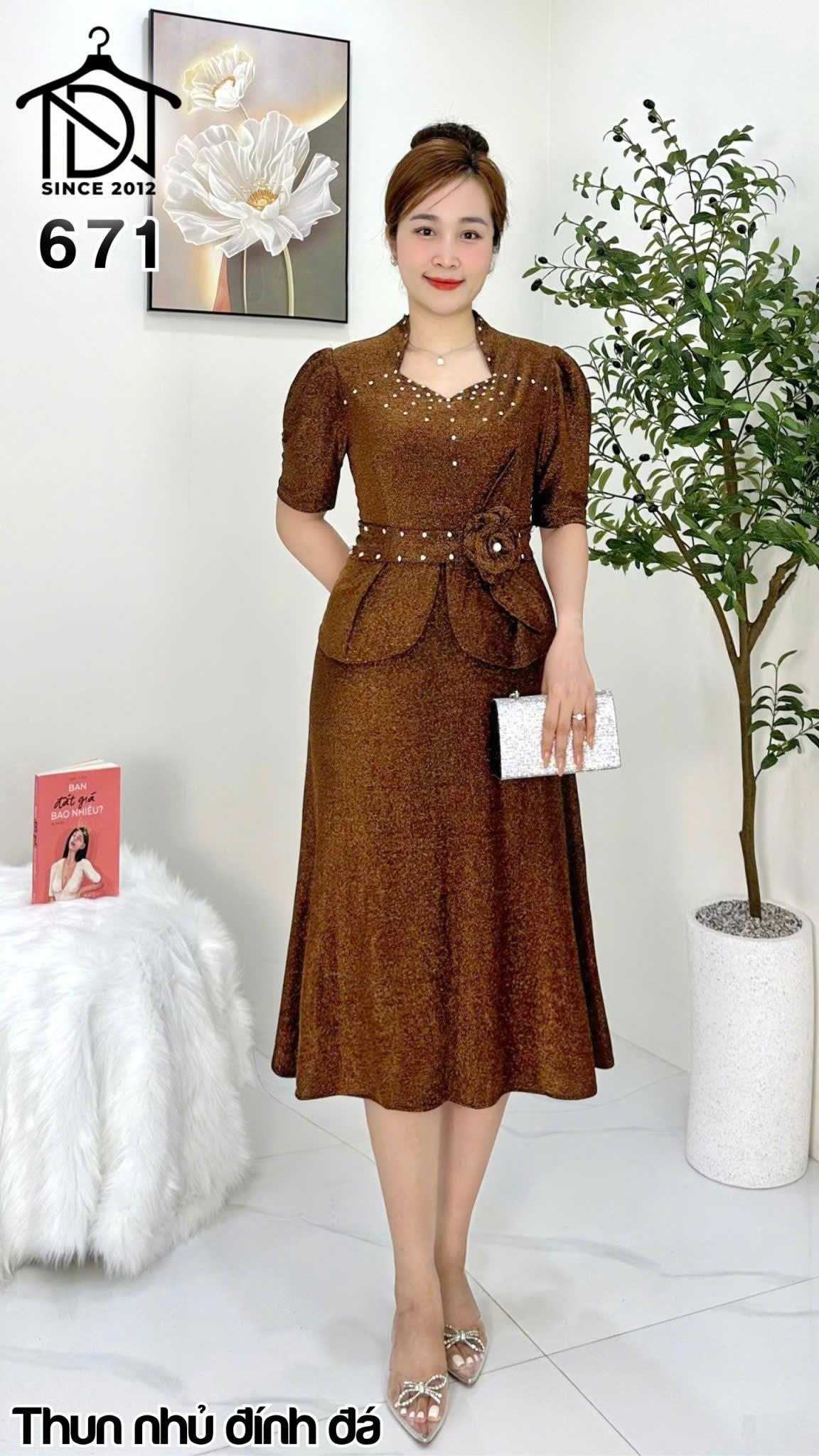Đầm trung niên dự tiệc sang trọng vải kim tuyến nhũ kim sa đính đá tặng mẹ co giãn tốt bigsize 80kg M671