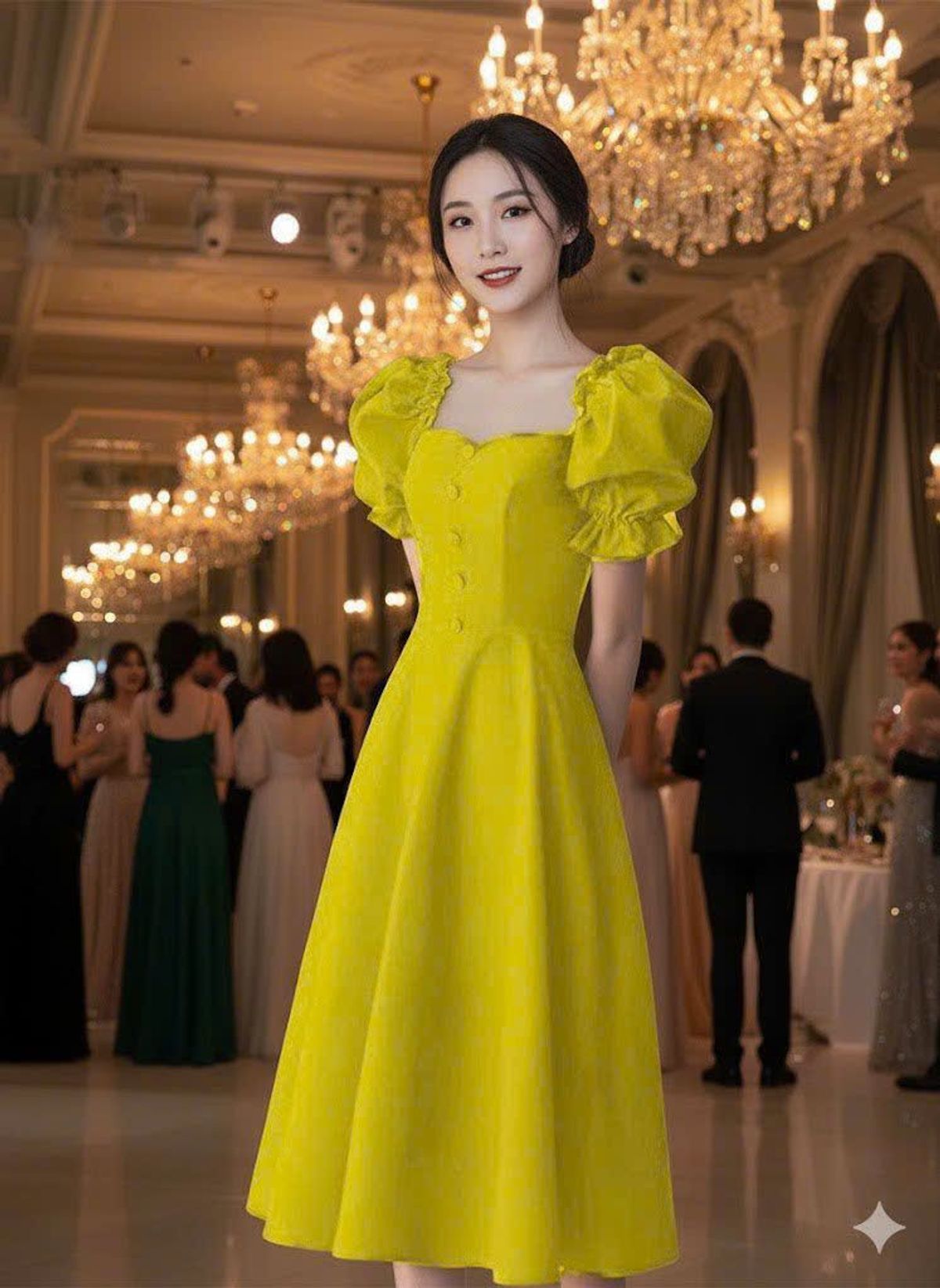 Đầm xoè cổ vuông nơ tay phồng sang trọng
