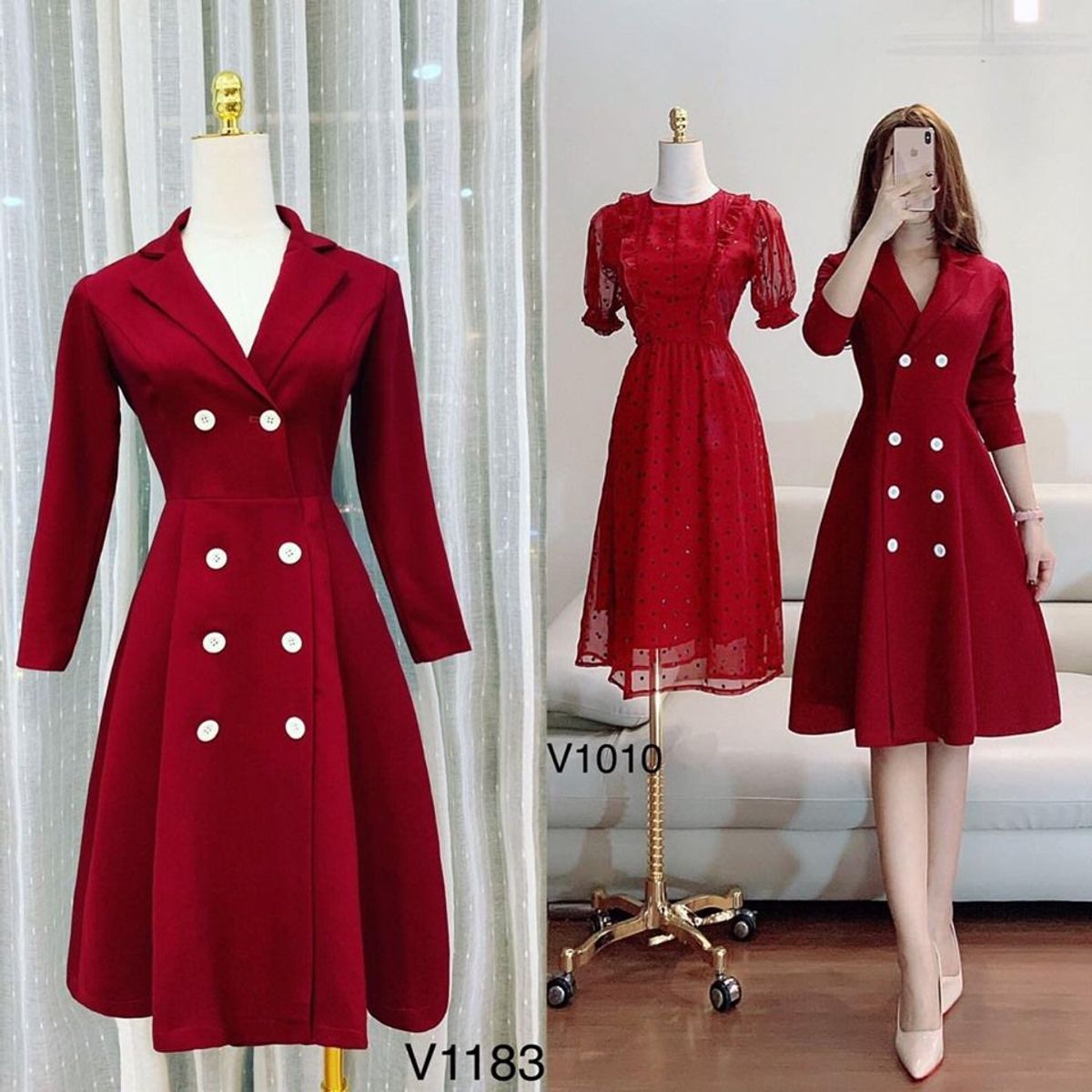 Đầm xòe tay dài phối nút V1183 giá sỉ - giá bán buôn