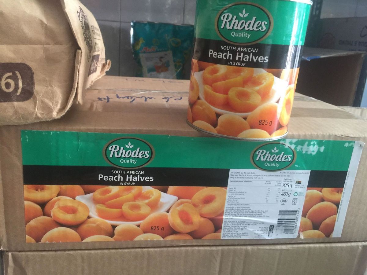 Đào ngâm Rhodes 825g được trực tiếp từ Nam Phi. Một thùng gồm 12 lon