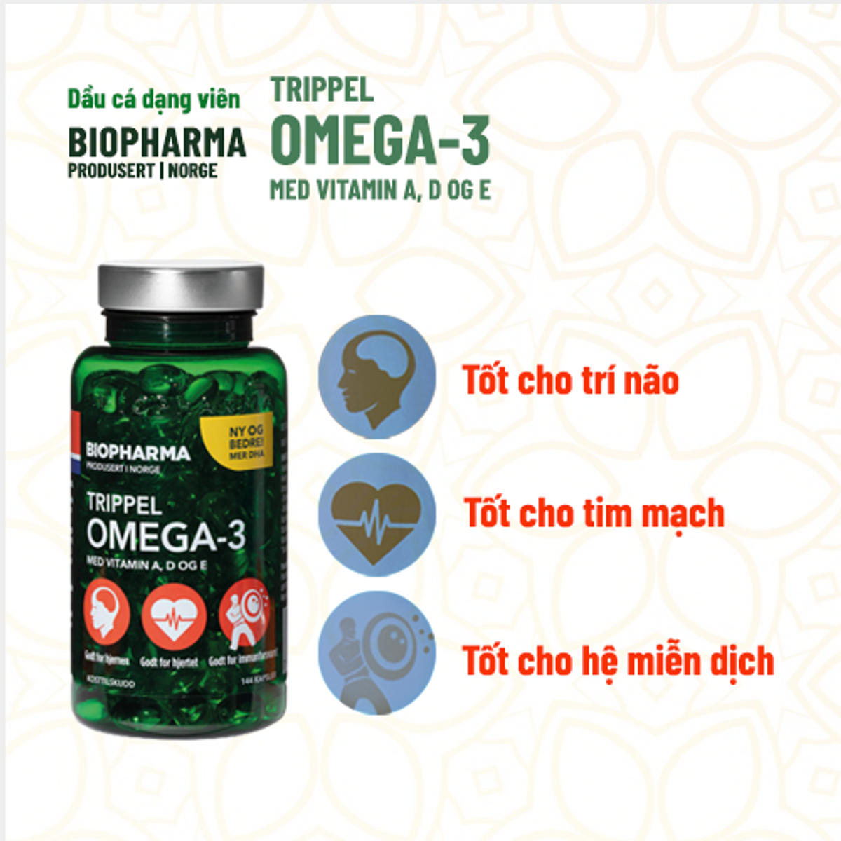Trippel Omega-3 là một trong các loại dầu cá “bình dân” và “phổ biến” nhất tại NaUy với hàm lượng dầu cá cô đặc là 72%. Trong mỗi viên nang dầu cá Trippel Omega-3 có chứa vitamin A, D, E và omega-3 ( bao gồm EPA + DHA ) tốt cho tim mạch, trí não và cả hệ miễn dịch của bạn.