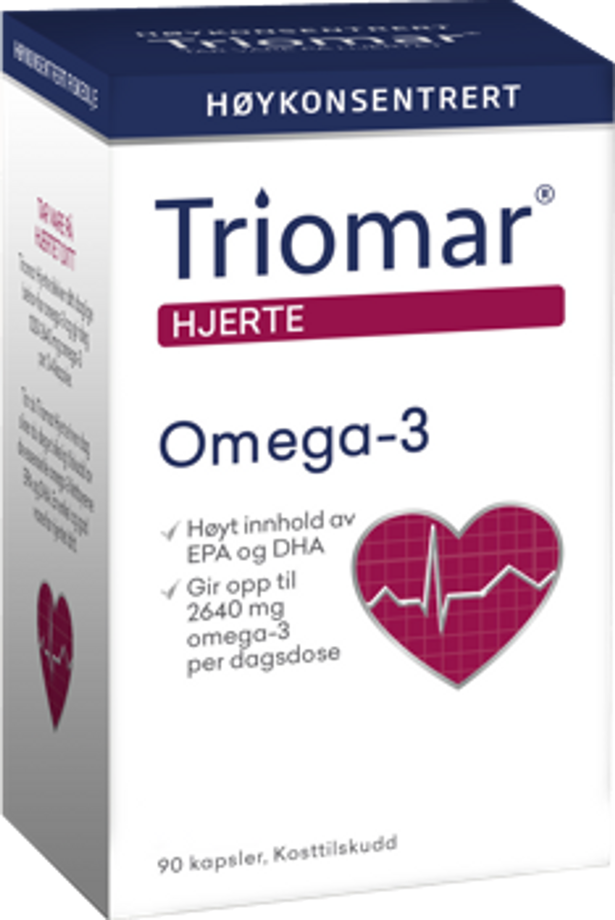 Dầu cá TRIOMAR HJERTE chính là sự kết hợp độc đáo giữa dầu cá đậm đặc 66% chứa nhiều các axit béo Omega-3 như EPA và DHA. TRIOMAR HJERTE có thể cung cấp lượng Omega-3 mà cơ thể cần trong một ngày, bên cạnh đó sản phẩm này còn có thể mang lại cho bạn từ 1320 - 26400mg nếu sử dụng từ 2 đến 4 viên một ngày.