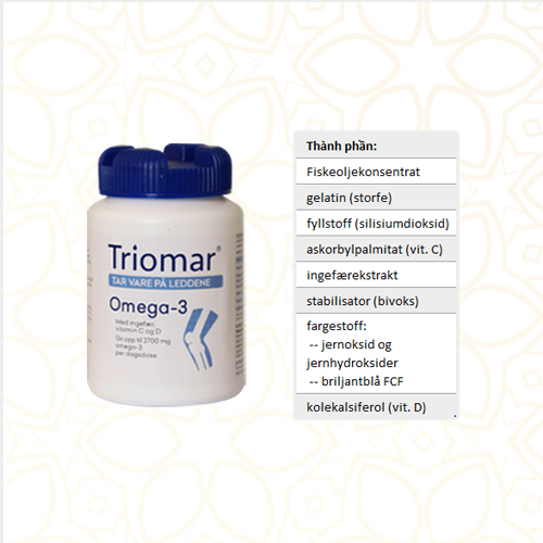 • TRIOMAR – một nhãn hàng rất nổi tiếng tại NaUy với 3 dòng sản phẩm chủ lực là DẦU CÁ CHO XƯƠNG ( TRIOMAR LEDD ) , DẦU CÁ CHO TIM ( TRIOMAR HJERTE ) , DẦU CÁ CHO NÃO ( TRIOMAR HJERNE ) đáp ứng đầy đủ nhu cầu bổ sung Omega-3 và bổ trợ cho từng bộ phận trên cơ thể tùy vào nhu cầu của người sử dụng. Trong đó: