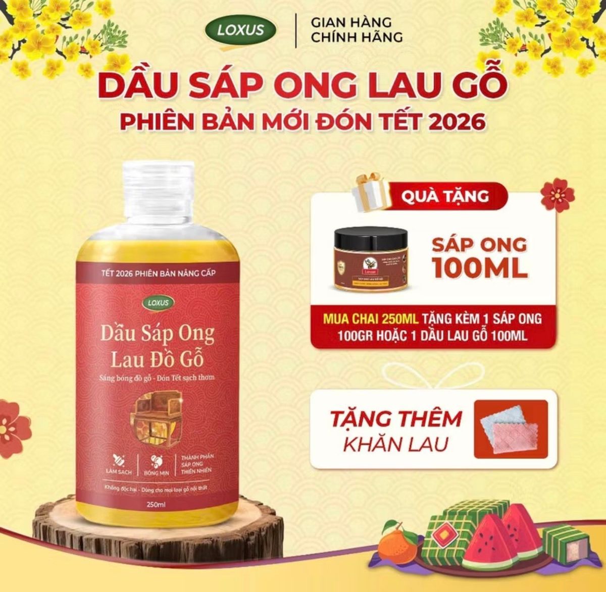Tên Sản Phẩm: Dầu sáp ong lau đồ gỗ Đại Lâm Mộc- Đánh bóng, làm mới, bảo vệ độ bền gỗ, hỗ trợ ngăn mối mọt, nấm mốc Thương Hiệu: Loxus Xuất xứ: Việt Nam Hạn Sử Dụng: 36 tháng
