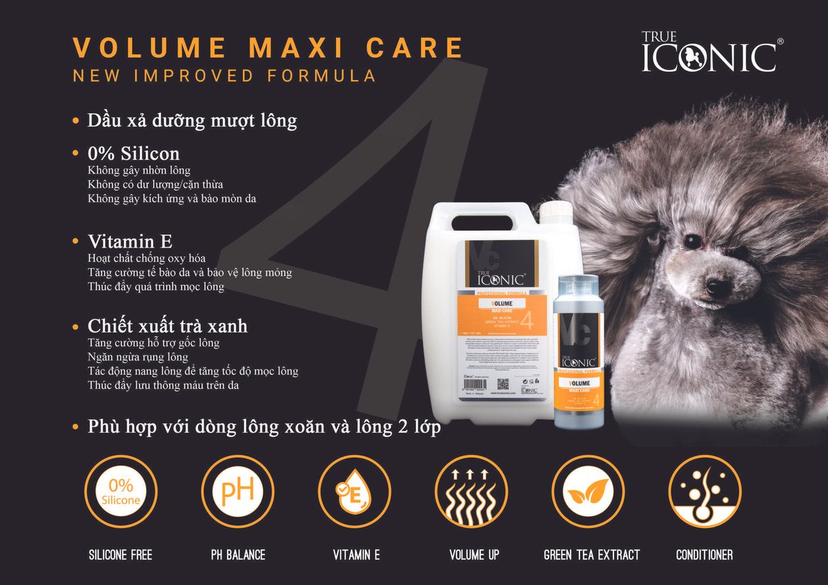 Công dụng: Dung dịch Volume Maxi Care chứa các dưỡng chất từ tinh chất trà xanh giúp làm dày và mượt lông đặc biệt sử dụng để phá vỡ kết cấu của các phần lông bị rối cục.