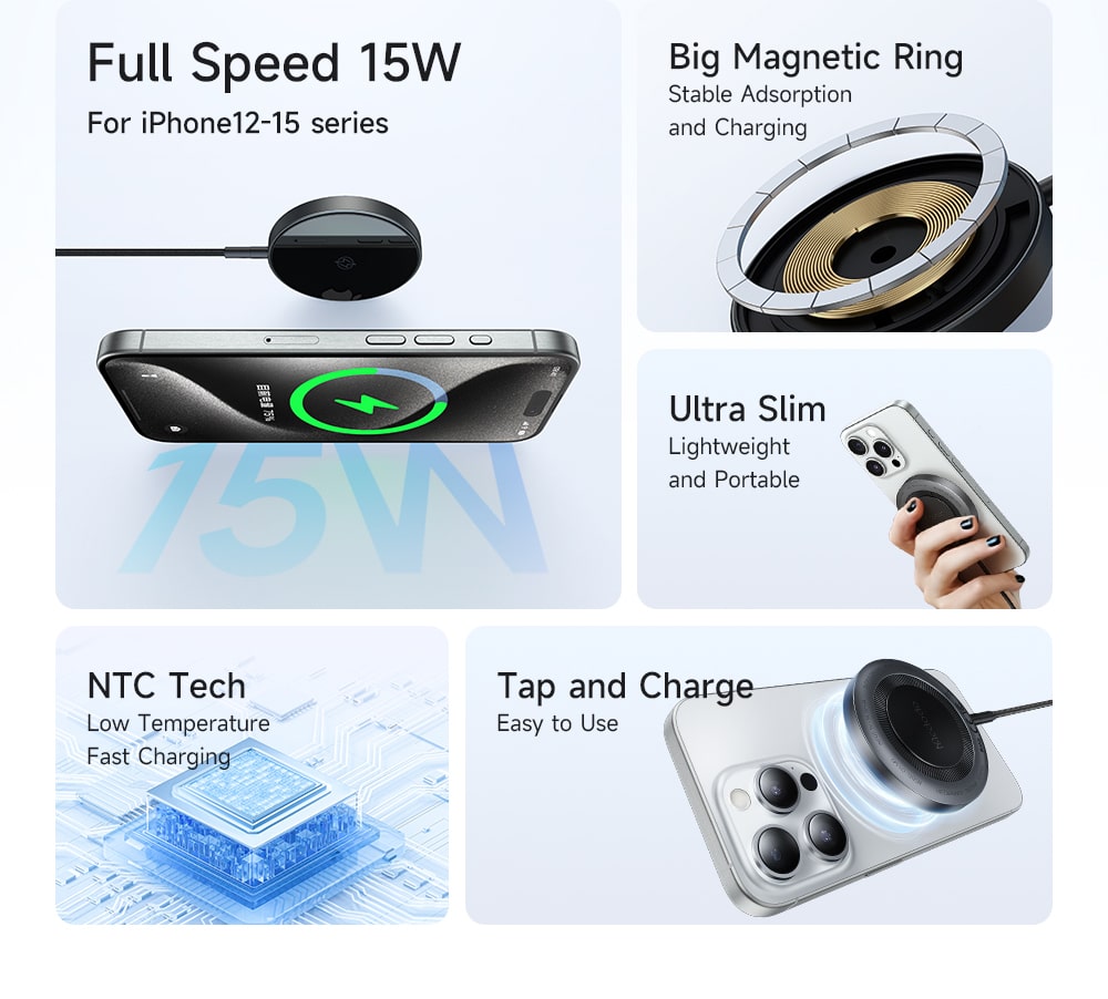Sạc Không Dây 15W: Sử dụng công nghệ sạc không dây tiên tiến, sản phẩm cung cấp khả năng sạc nhanh với công suất lên đến 15W, giúp bạn sạc nhanh và hiệu quả các thiết bị của mình.