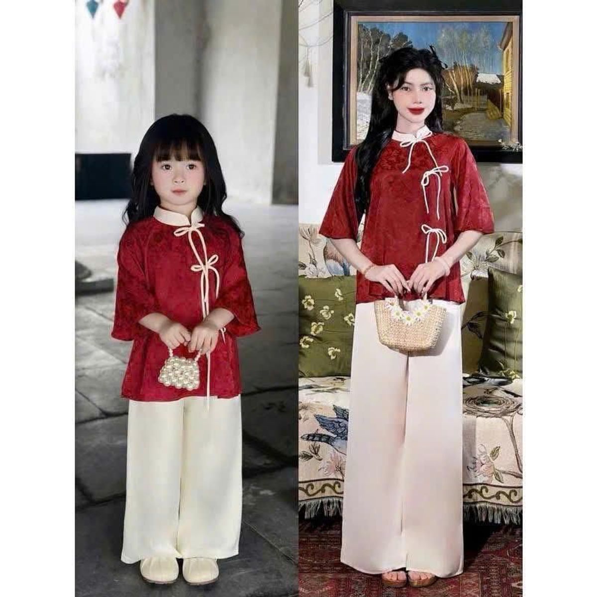 TÊN SẢN PHẨM: Set đồ lam mẹ và bé - Aó gấm cổ tàu đính nơ kèm quàn phi lụa ống suông