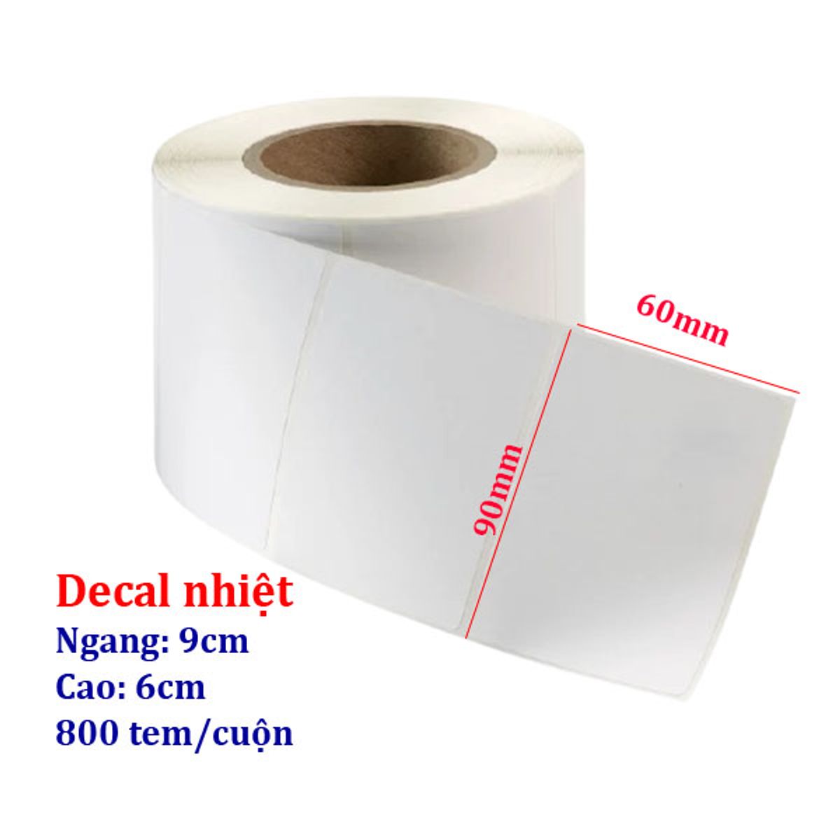 Giấy in mã vạch 1 tem 90x60mm là Giấy decal 1 tem/hàng, cỡ tem 90mm x 60mm, khổ giấy rộng 94mm, cuộn dài 50m in tem nhãn mã vạch.