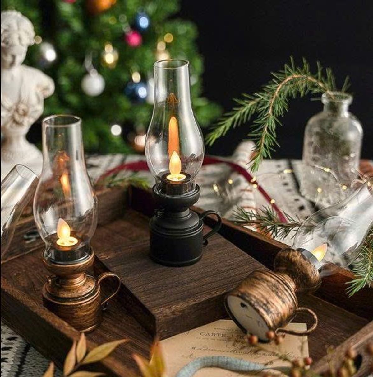 Đèn dầu cổ điển sử dụng pin,tìm đèn đong đưa kết hợp với ánh sáng vàng của đèn led tạo nên hiệu ứng như ngọn lửa thật.