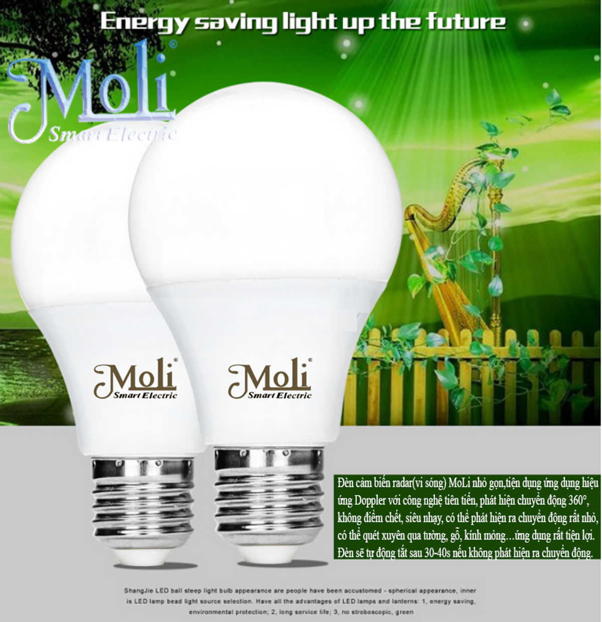 Bóng đèn cảm ứng radar MOLI là bóng đèn đầu tiên trên thị trường Việt Nam trang bị trang bị cảm biến radar và cảm biến quang ngay trong bóng đèn giúp bật đèn chỉ khi trời tối và có chuyển động. Khi không có chuyển động, bóng đèn sẽ tự động tắt sau 20s, đặc biệt là sẽ không bật đèn khi trời sáng để tiết kiệm điện tối đa và hiệu quả