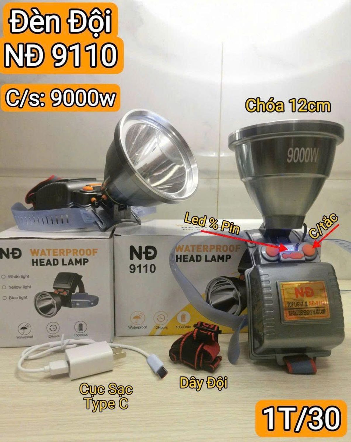 ĐÈN PIN ĐỘI ĐẦU SIÊU SÁNG 9000W NĐ 9110