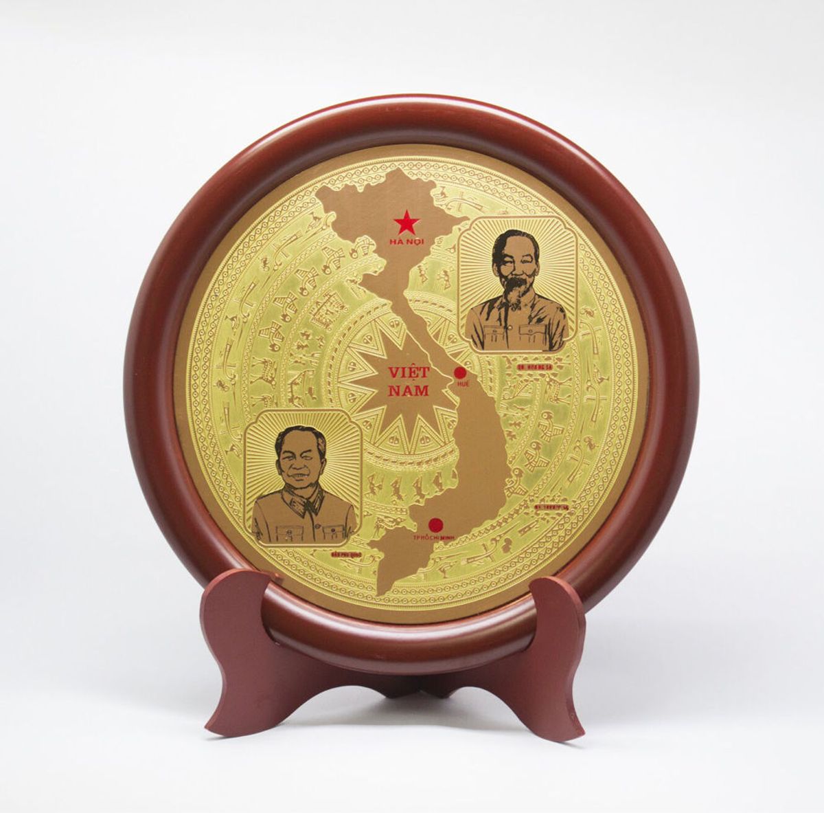 - Đĩa để bàn mang hình Mặt trống đồng kết hiẹp với bản đồ Việt Nam và chân dung Bác Hồ, Bác Giáp.Đĩa để bàn là một sản phẩm được làm từ một làng nghề truyền thống Việt Nam , Sản phẩm rất thích hợp cho bàn làm việc , trưng bày tủ kính, làm quà tặng cho bạn bè , người thân, đặc biệt cho các doanh nghiệp