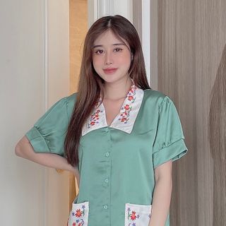 Đồ bộ nữ mặc nhà pijama cổ in hoa Hồng phom 45-60kg mặc
