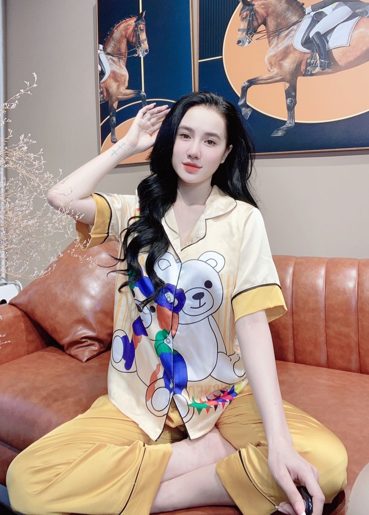 Đồ bộ nữ mặc nhà pijama Satin in gấu sao Dài cộc giá sỉ/bán buôn