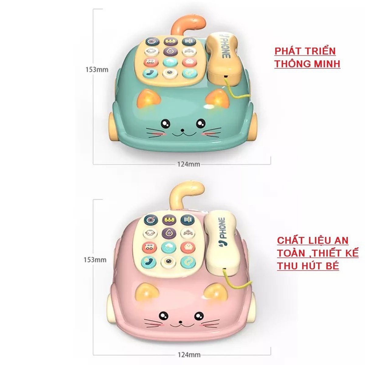 Điện thoại có 12 phím bấm chức năng khác nhau tích hợp bài hát, âm thanh, đèn, nhạc Song Ngữ... Tay cầm nối dây tránh lạc.