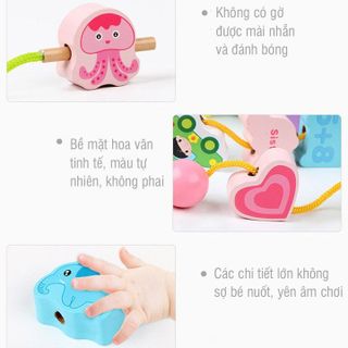 Một trong các tác dụng chính của đồ chơi Montessori đó là phát triển kĩ năng vận động tinh của trẻ. Bộ đồ chơi xâu hạt giúp trẻ rèn luyện sự khéo léo của đôi tay, qua việc xỏ dây các khối gỗ để tạo thành hình dễ thương.