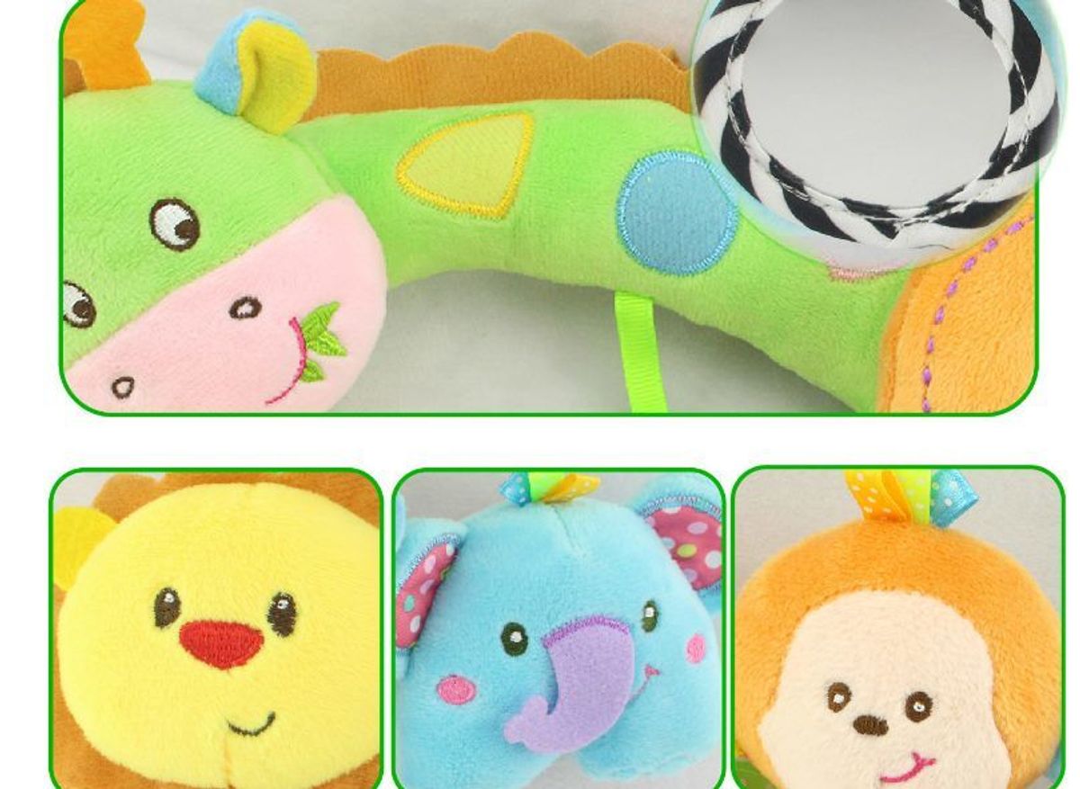 =>Có 3 hình để bố mẹ lựa chọn: cá heo, hươu cao cổ, cành cây. Trong mỗi hình được treo từ 3-4 thú bông nhỏ bên trong được gắn xúc xắc. Khi bé cầm vào sẽ phát ra tiếng xúc xắc.