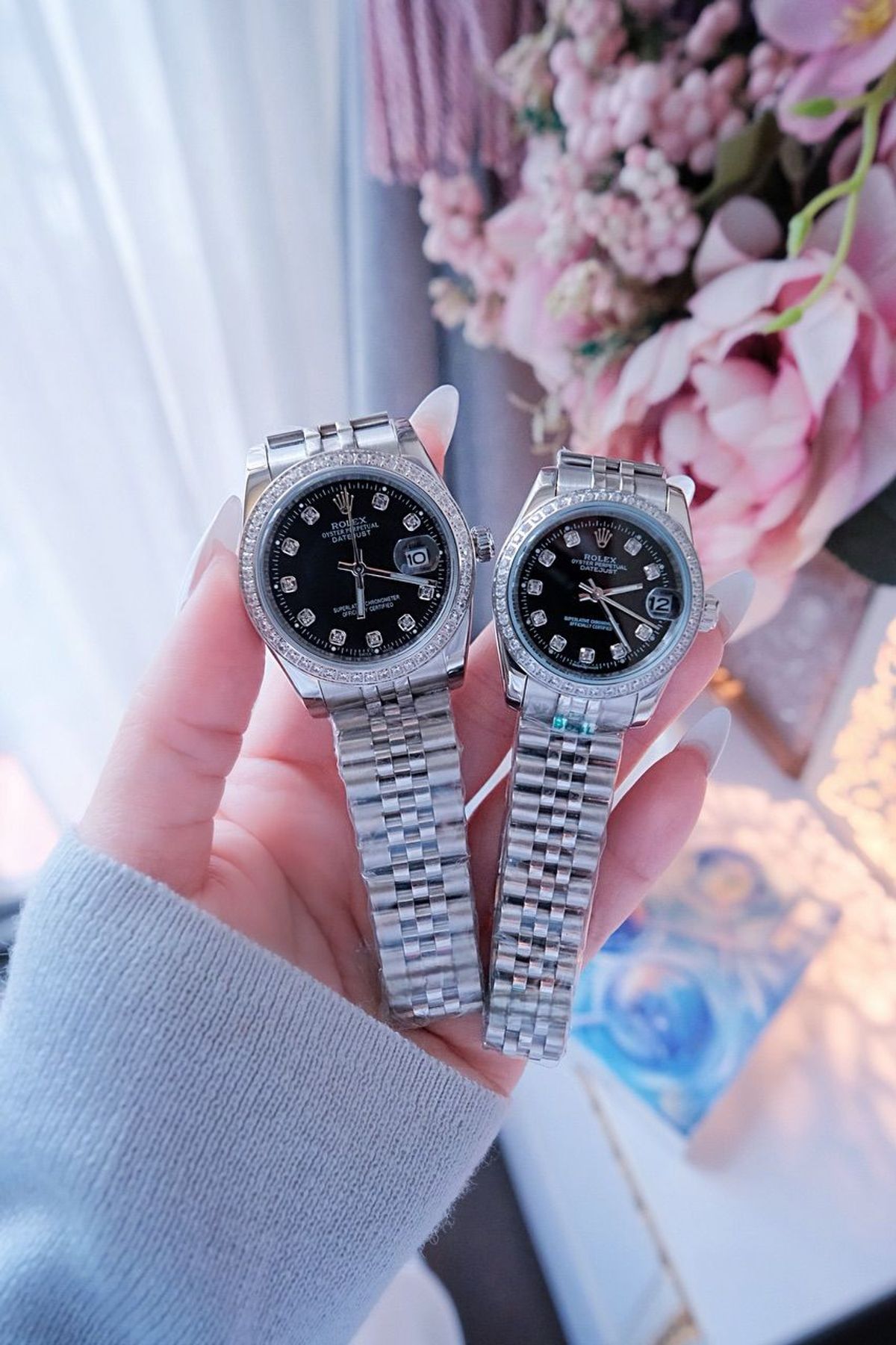 ĐỒNG HỒ NAM NỮ CAO CẤP RÔLET DÂY THÉP BẠC MẶT ĐEN KÍNH SAPHIRE VIỀN HỘT giá sỉ/bán buôn