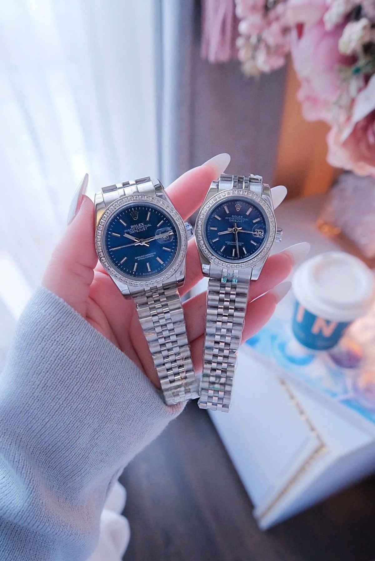 ĐỒNG HỒ NAM NỮ CAO CẤP RÔLET DÂY THÉP BẠC MẶT XANH VIỀN HỘT giá sỉ/bán buôn