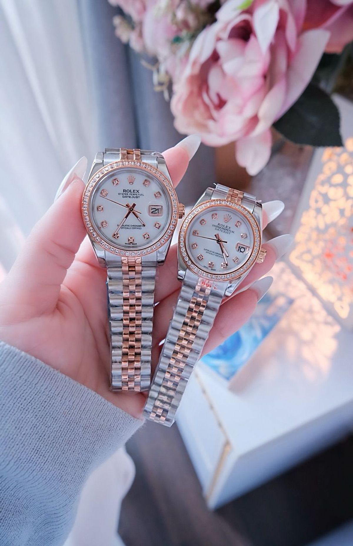 ĐỒNG HỒ NAM NỮ CAO CẤP RÔLET DÂY THÉP DEMI HỒNG KÍNH SAPHIRE VIỀN HỘT giá sỉ/bán buôn