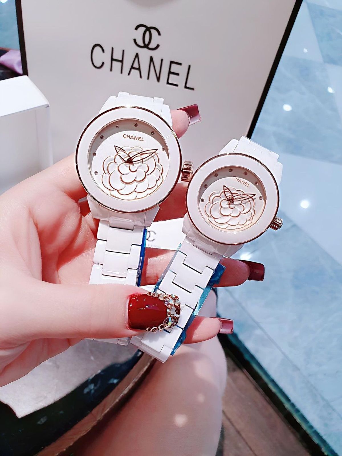 ĐỒNG HỒ NỮ CAO CẤP CHANEU CERAMIC TRẮNG MẶT HOA VIỀN HỒNG VÀ VIỀN BẠC giá sỉ - giá bán buôn