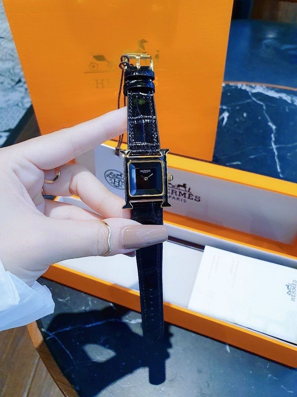 ĐỒNG HỒ NỮ CAO CẤP HERMET DÂY DA FULL ĐEN NIỀNG VÀNG MẶT KÍNH CẮT GIÁC giá sỉ/bán buôn