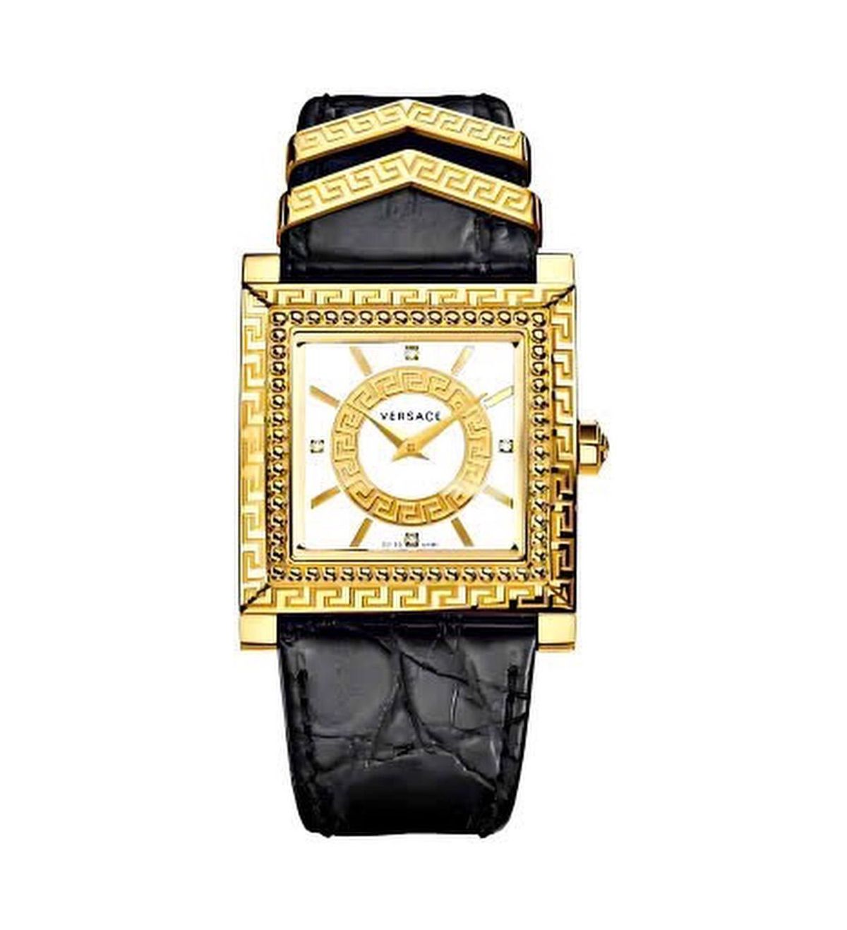 Viền ngoài đồng hồ khắc họa tiết Hy Lạp cổ, đặc trưng của thương hiệu đồng hồ nữ Versace.