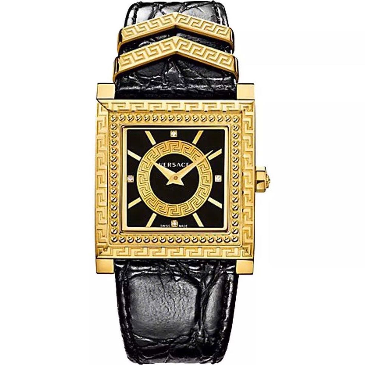 Viền ngoài đồng hồ khắc họa tiết Hy Lạp cổ, đặc trưng của thương hiệu đồng hồ nữ Versace.