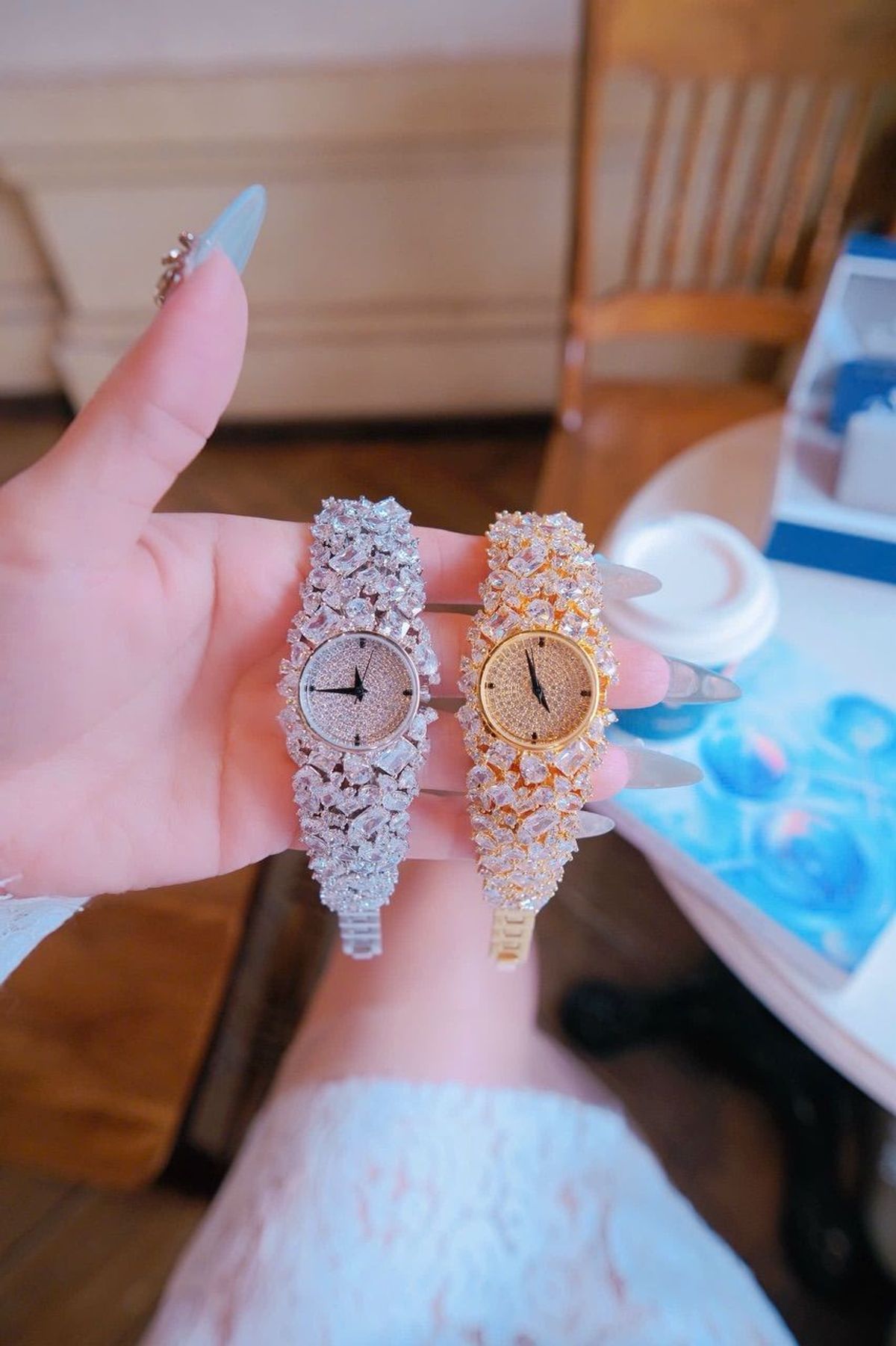 ✨ Hai phiên bản đồng hồ đính đá cao cấp – Bạc tinh khiết & Vàng sang trọng – như hai viên kim cương sáng lấp lánh trên cổ tay bạn.