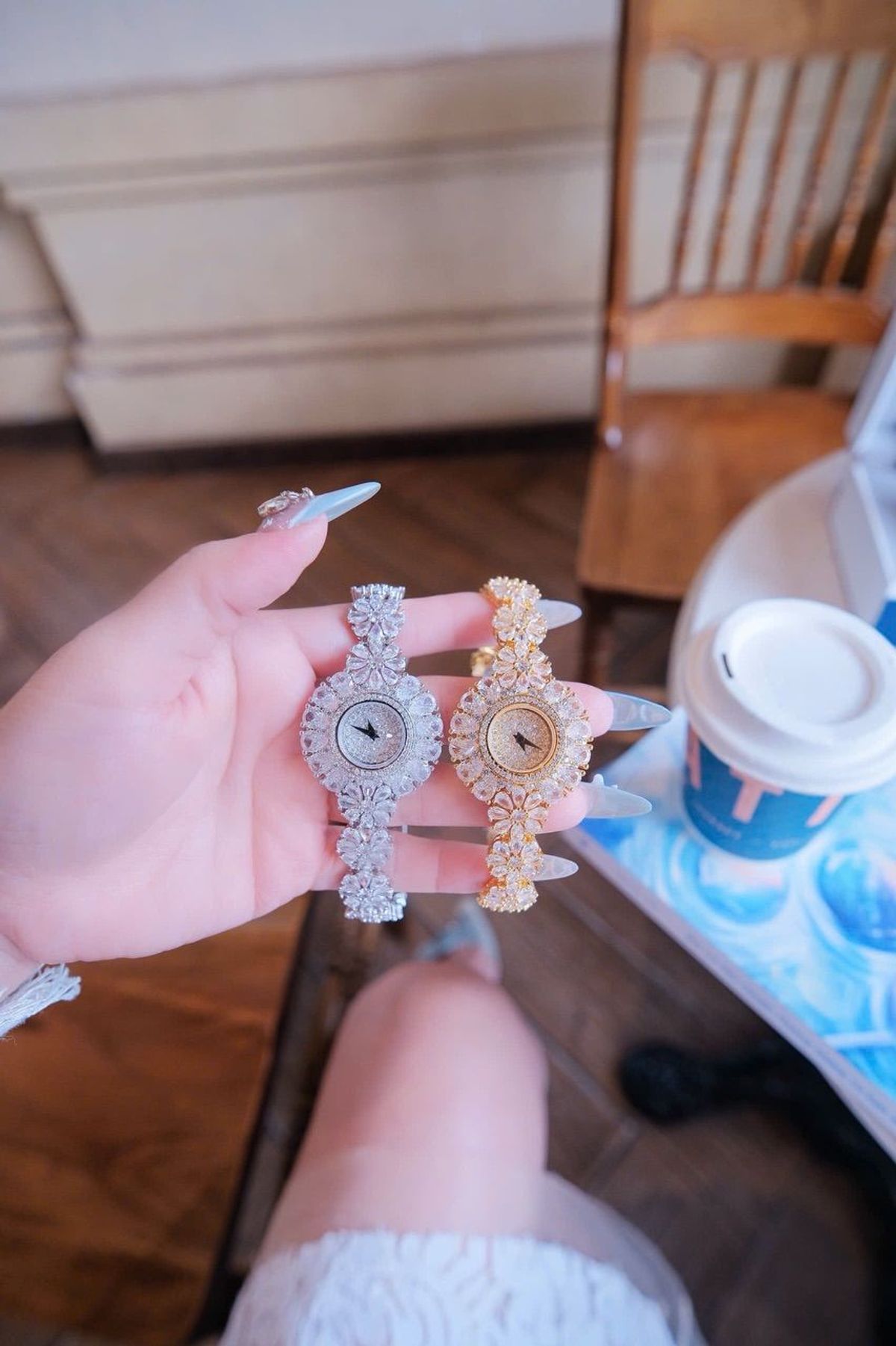 🌟 Thiết kế đính đá tinh xảo, mặt đồng hồ phủ kín pha lê – mỗi chuyển động tay đều rực rỡ như đoá hoa mai mùa xuân.