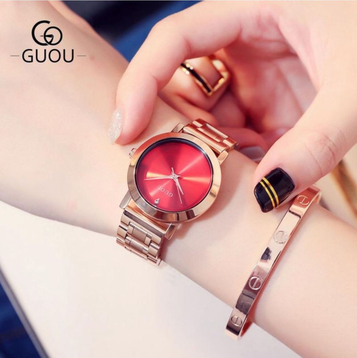 GUOU thì Viền và dây đúc kim loại màu Vàng Đồng, còn GUOU màu Vàng Chanh không giống khi mua hàng, rẻ hơn 100-200k.