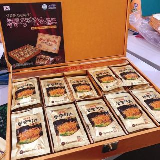 ĐÔNG TRÙNG HẠ THẢO HỘP GỖ VÀNG KANGHWA (60 gói dạng nước) DÙNG CHO NGƯỜI ĐAU LƯNG MỎI GỐI THẬN YẾU, HO HEN VIÊM PHẾ QUẢN HOẶC NGƯỜI SUY NHƯỢC CƠ THỂ, MỚI ỐM DẬY...Hàng chính hãng, xách tay Hàn Quốc xịn 100% Được chiết xuất từ Đông trùng hạ thảo tuyết, hàm lượng Đông trùng hạ thảo 68%, dạng nước, hộp 60 gói, 30ml/ gói.Công dụng:Điều hoà, cải thiện nội tiết, khả năng sinh lý, bổ thận tráng dương ở nam giới, suy thận, mắc các bệnh lý về thận phụ nữ cần cải thiện chứng lạnh tử cung (hiếm muộn), phụ nữ trong giai đoạn tiền mãn kinh và mãn kinh. Giảm mệt mỏi, đau nhức suy nhược cơ thể, suy nhược thần kinh.Cải thiện hệ hô hấp, rất tốt cho người ho lâu ngày, lao phổi, hen suyễn.Tăng cường sức đề kháng nhanh cho người cần hồi phục sau khi ốm nặngCải thiện rõ rệt chứng mất ngủ, bồn chồn. đặc biệt thích hợp với những người trung niên và cao tuổi, những người bị suy thận, suy gan, cao huyết áp, hàm lượng mỡ và đường trong máu cao, suy nhược cơ thể, bị stress do áp lực công việc quá mức…Phòng chống ung thư, hỗ trợ điều trị ung thư...