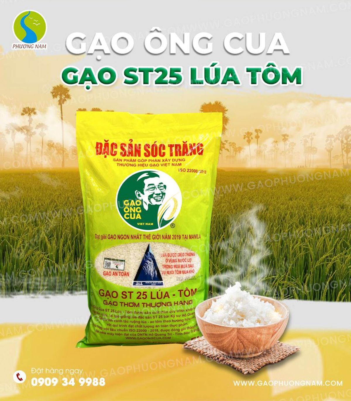 Gạo ST25 Lúa Tôm Chính Hãng – Thương Hiệu Gạo Ông Cua | Gạo Ngon Nhất Thế GiớiGạo ST25 lúa tôm chính hãng – thương hiệu Gạo Ông Cua là dòng bông thơm cao cấp của Việt Nam, được người tiêu dùng trong và ngoài nước đánh giá rất cao nhờ chất lượng vượt trội, hương vị tự nhiên và độ an toàn cho sức khỏe. Đây là sản phẩm tiêu biểu của mô hình canh lúa lúa – tôm bền vững tại vùng Đồng bằng sông Cửu Long, đặc biệt là tỉnh Sóc Trăng.