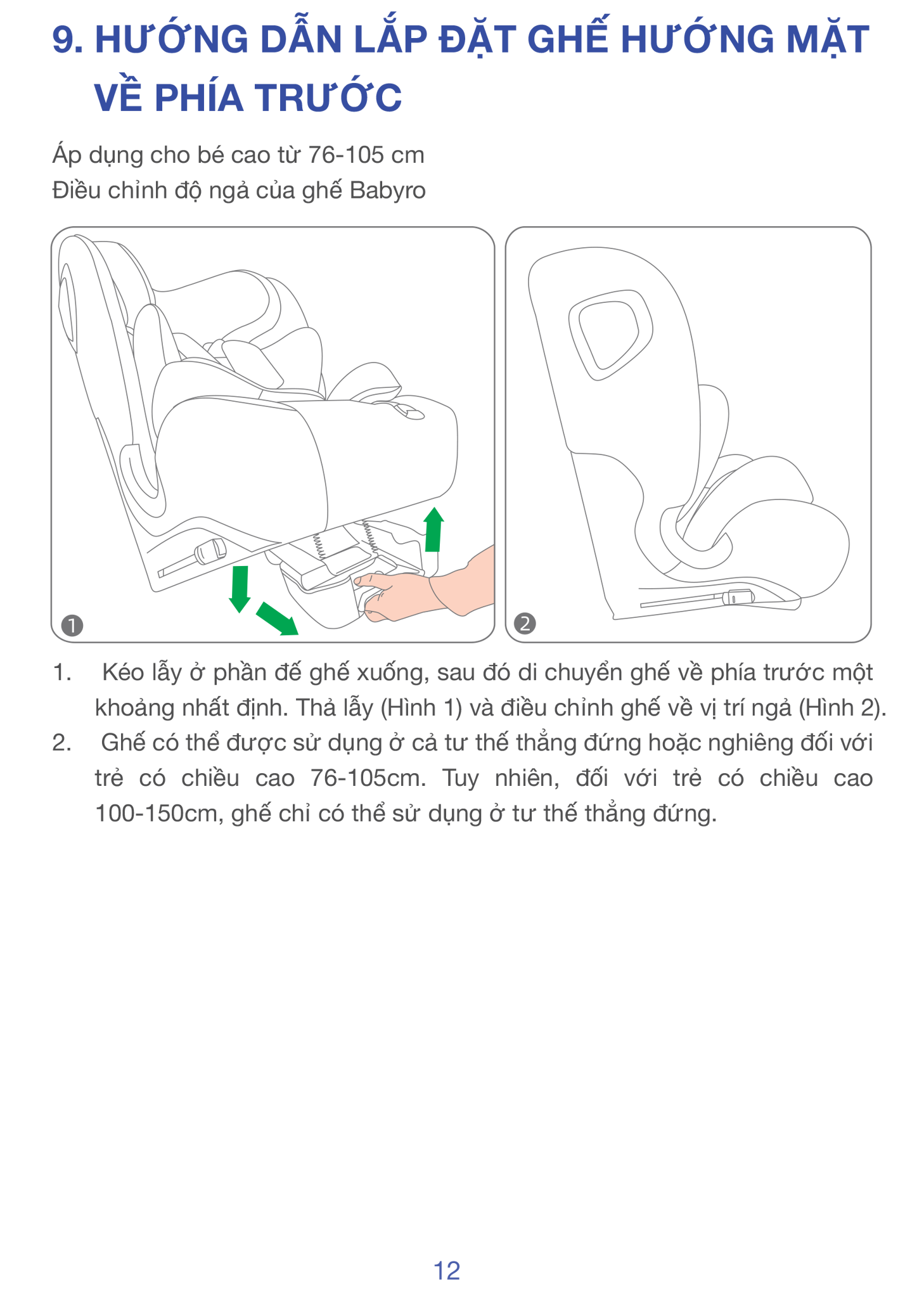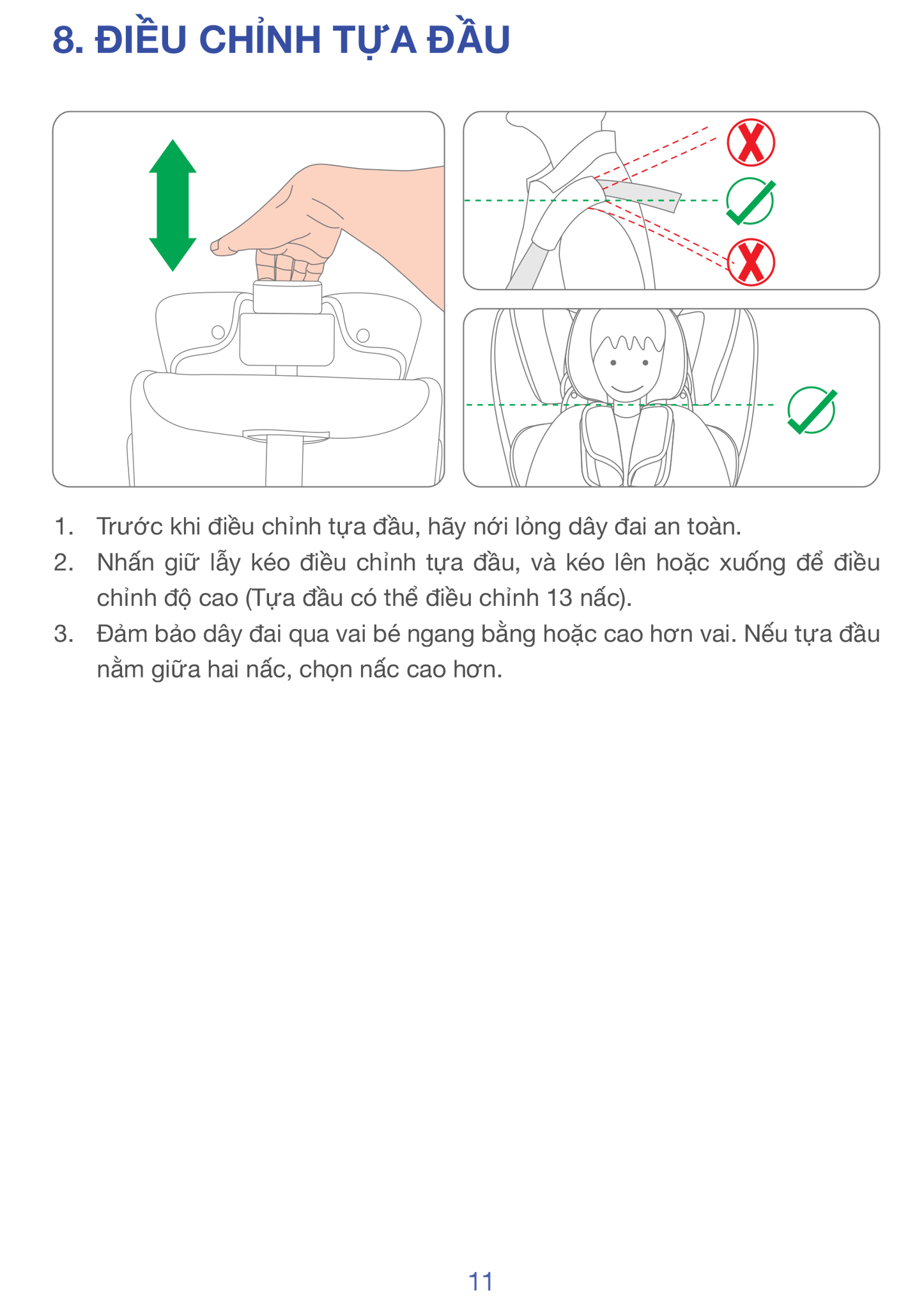 Tựa đầu 11 nấc - Luôn vừa vặn theo chiều cao trẻ: Từ 76 - 150 cm, chiều cao thay đổi liên tục. Tựa đầu có thể nâng lên trong vài giây, phù hợp từng giai đoạn phát triển của trẻ.